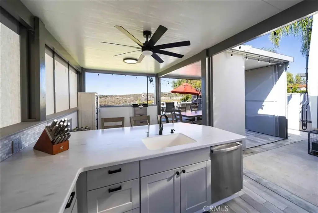 Situated on a massive private lot, this stunning Alumawood and stucco structure delivers an exceptional indoor-outdoor living experience. The expansive buildout features gorgeous residential-style flooring throughout, a full residential kitchen with refrigerator, stove, oven, dishwasher, and beautifully crafted cabinetry, plus an oversized island topped with fantastic countertops—perfect for entertaining. Ceiling fans enhance comfort year-round, while the thoughtfully designed layout includes a dedicated dining area, family area, and a spacious kitchen that feels like home. Step outside to enjoy breathtaking mountain views and unforgettable sunset skies from the large patio, ideal for hosting gatherings or relaxing evenings. The property is fully fenced for privacy and includes a low-maintenance artificial grass area, offering both beauty and functionality. This is a rare opportunity to own a private, turnkey retreat that blends residential comfort with resort-style outdoor living.Rancho California RV Resort enriches your lifestyle with a host of top-tier amenities. Owners enjoy a 14-hole executive par-3 golf course at no extra cost, along with access to five pools and jacuzzis, tennis and pickleball courts, a dog park, two clubhouses, a fitness center, a fishing pond, horseshoes, and a bocce ball area. The resort is guard-gated with no age restriction, ensuring a welcoming environment for all. Monthly HOA fees cover unlimited use of the golf course, all amenities, trash pickup, and water, sewer, and common area maintenance. With financing available, the RV Resort offers the perfect blend of a private property lifestyle and a vibrant community atmosphere.