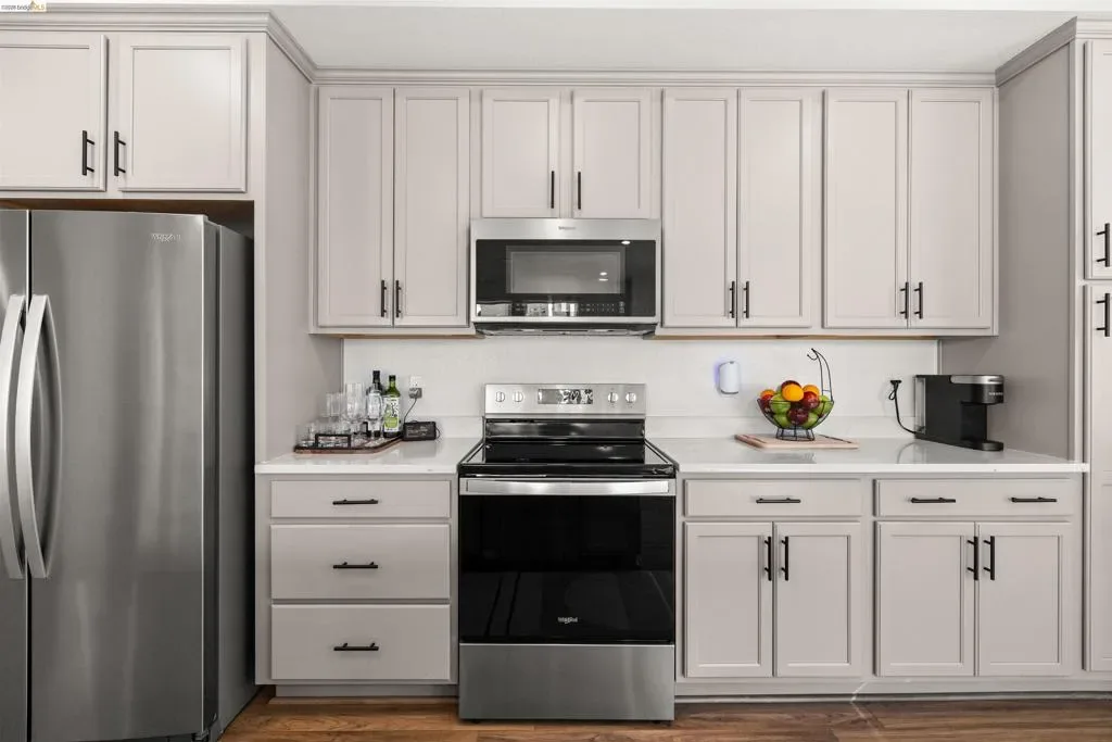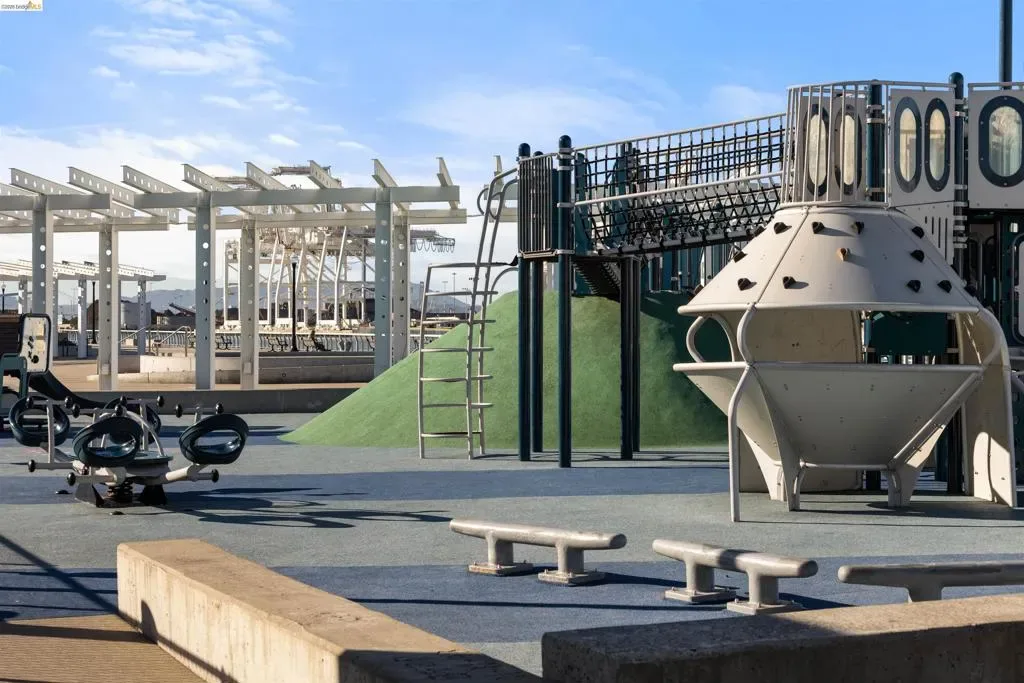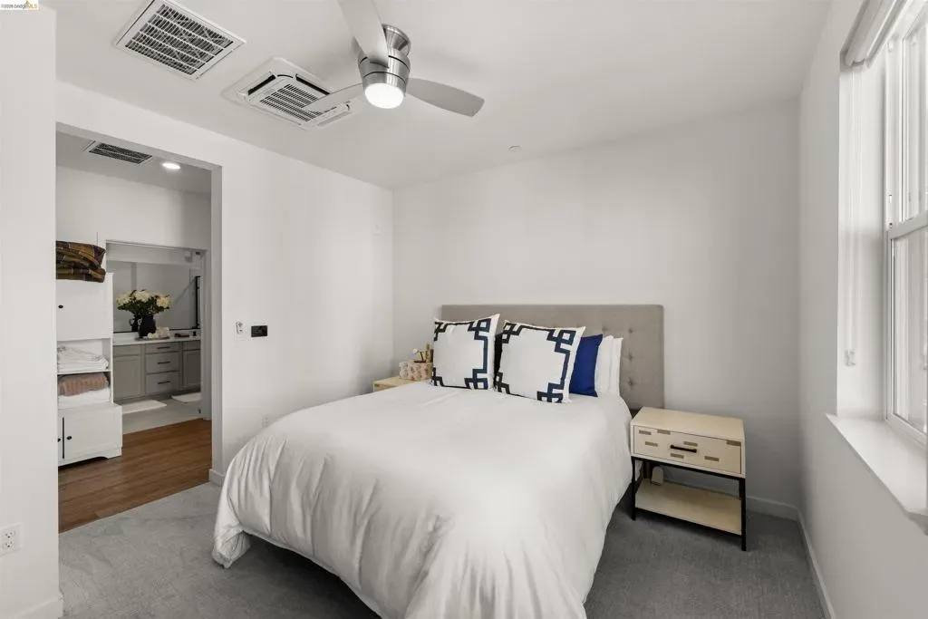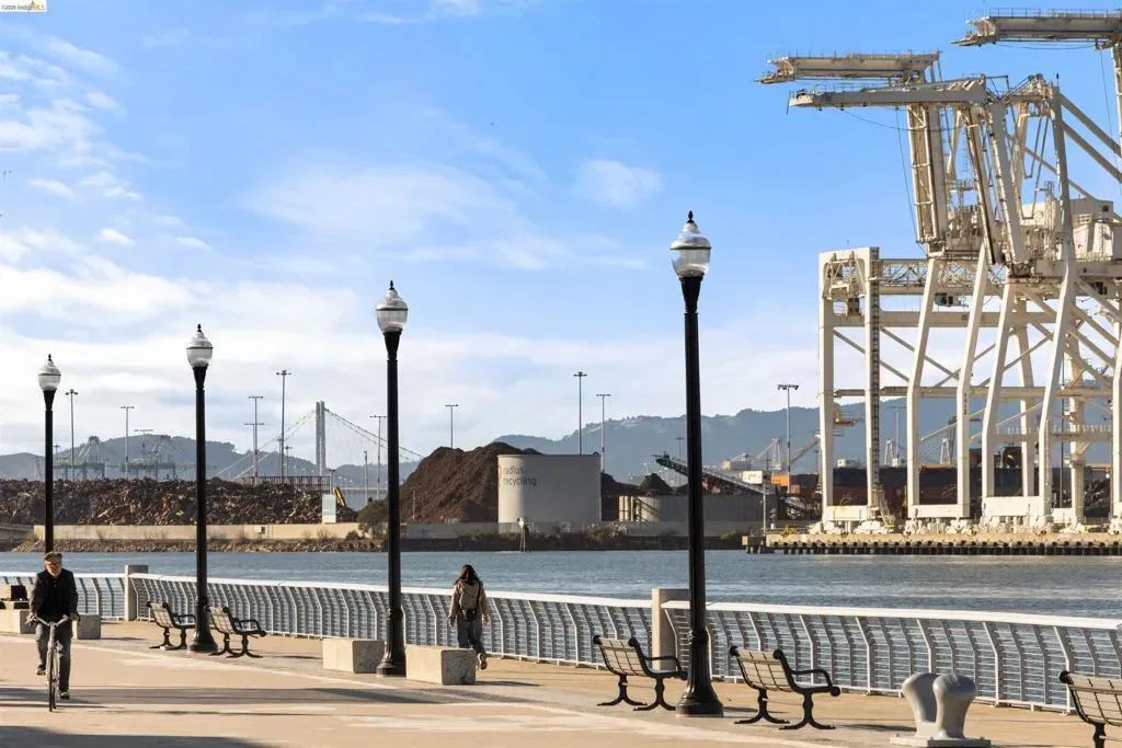 Welcome to this stunning, nearly new, contemporary corner condo in Alameda’s Bay 37 waterfront community, completed in 2023. This two-bedroom, two-bath home features a roomy, open-concept layout, perfect for modern living. The heart of the home is a shining kitchen with a central island, flowing seamlessly into the living room, which is bathed in natural light from sweeping windows. Enjoy a captivating “peek-a-boo” view of Oakland’s Inner Harbor and the distant top of City Hall while dining. For truly panoramic vistas, including the Bay Bridge and downtown San Francisco, residents can enjoy the shared rooftop deck. The home includes many modern conveniences: in-unit laundry, a dedicated garage with EV charging capabilities, and an owned solar system. Bay 37 offers residents an array of amenities, including waterfront walking paths, picnic areas, a park and playground, and a community dock. Commuting is effortless with a complimentary water taxi service to Jack London Square and a free shuttle to 12th St. Bart Station, providing easy access to SF via ferry or Bart. Plus, neighborhood essentials like Target and Safeway, along with diverse dining options, are all within a half-mile radius!