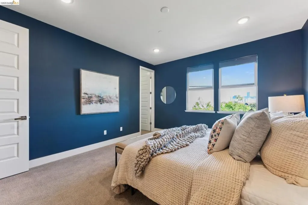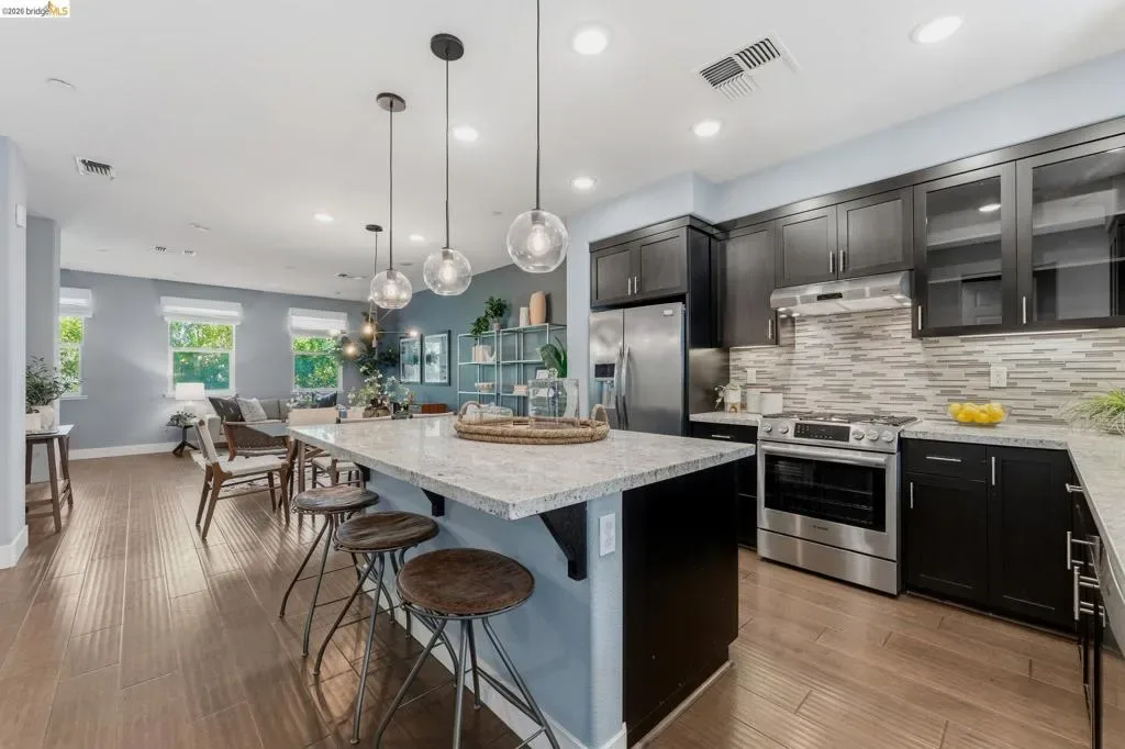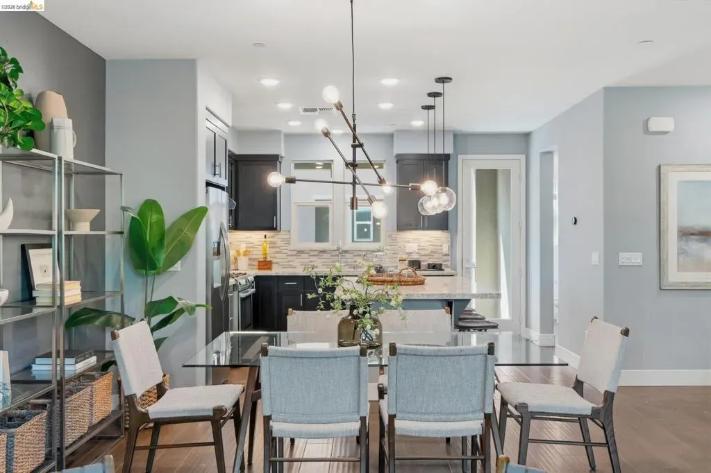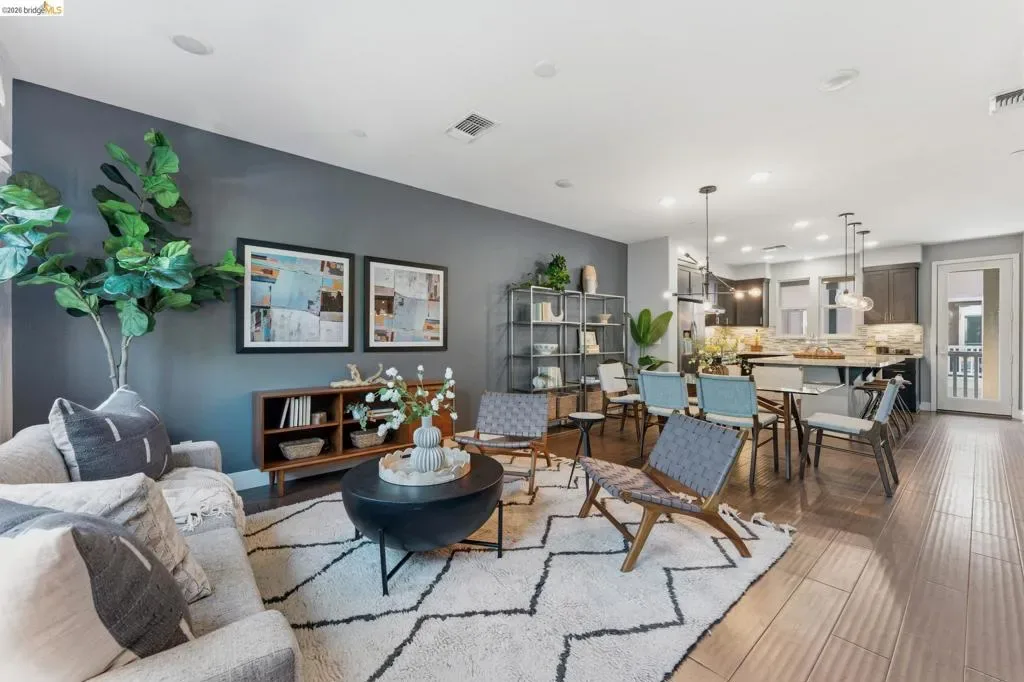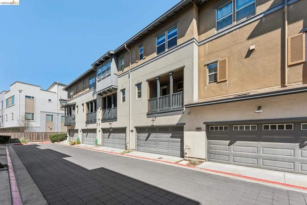 Stylish 3-Level Condo with Modern Finishes | 3BD / 3.5BA | Alameda Built in 2016, this well-maintained 3-bedroom, 3.5-bathroom condo offers approximately 1,784 sq ft of thoughtfully designed living space across three levels. The main living area features an open-concept kitchen, dining, and living room layout with access to a private balcony off the kitchen. The kitchen includes a large center island with breakfast bar seating, granite countertops, built-in cabinetry, and a spacious walk-in pantry, providing ample storage and functionality. Flooring throughout the home includes a combination of tile, hardwood, and carpeted bedrooms. All bedrooms offer comfortable separation across levels, and the home includes 3 full bathrooms plus a powder room off the kitchen for guests. Laundry is conveniently located on the third floor. Additional features include two-zone air conditioning, Nest thermostat system, and abundant thoughtful storage throughout. The property includes a 2-car attached garage and is located adjacent to a green community space. Guest parking is available along Diller Street. Convenient Alameda location with access to local amenities, shopping, and commuter routes.