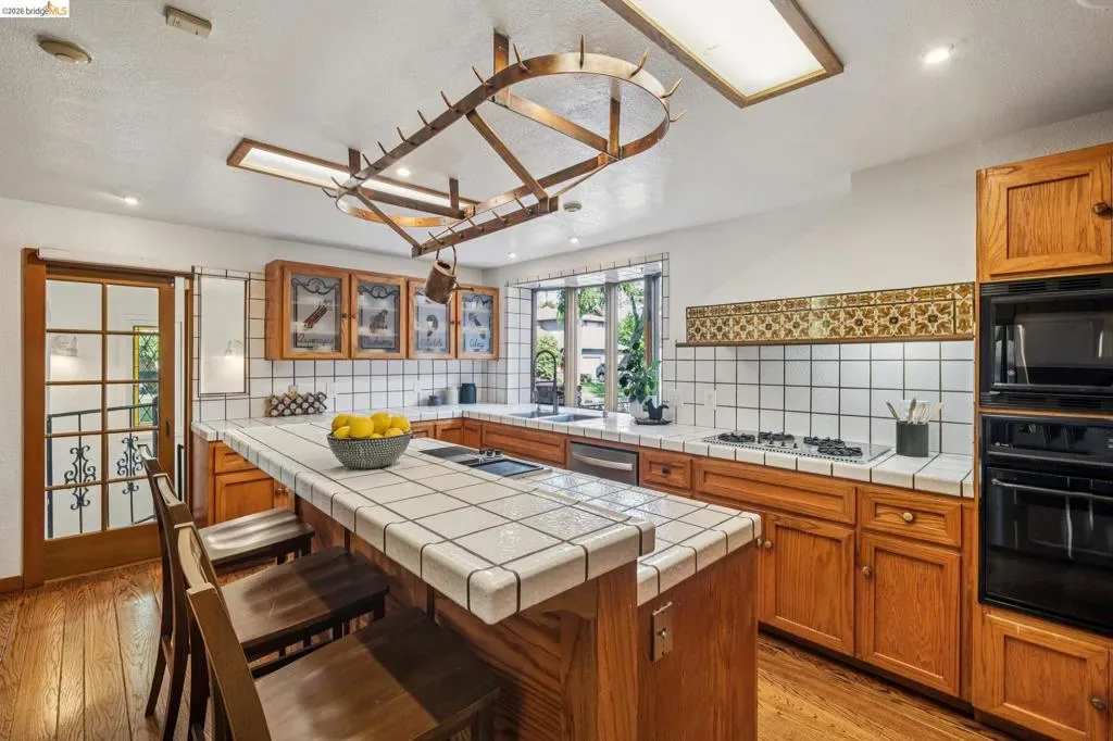 There are times when a property exudes so much character and charm that you are compelled to explore it. This is one such home and it truly delights the senses. Welcome to 824 Paru Street, an enchanting 1910 Storybook home in Alameda’s coveted Gold Coast—just one block to the lagoon and Franklin Park/Franklin Elementary. Behind a brick garden wall and gated entry, this whimsical 3,523 SqFt home showcases steep gables, sweeping curved rooflines, arched doorways, stained glass, and classic English cottage charm—a rare and beautifully preserved example of early 20th century design. Inside, the living room is a true centerpiece with rich wood paneling, leaded glass windows, and a striking fireplace with custom millwork, while classical wainscoting lines the halls leading to a dramatic second-floor landing beneath the steep roofline. Upstairs, new red oak floors complement three primary bedrooms, each with an ensuite bath (2.5 total), while original white oak floors in the living and dining rooms have been thoughtfully restored. The backyard patio invites quiet moments under a wisteria-draped gazebo. Public record notes five bedrooms; the lower level lives as a spacious family room with copper fireplace and a refined library or office with adjacent full bath. This home is truly a gem!