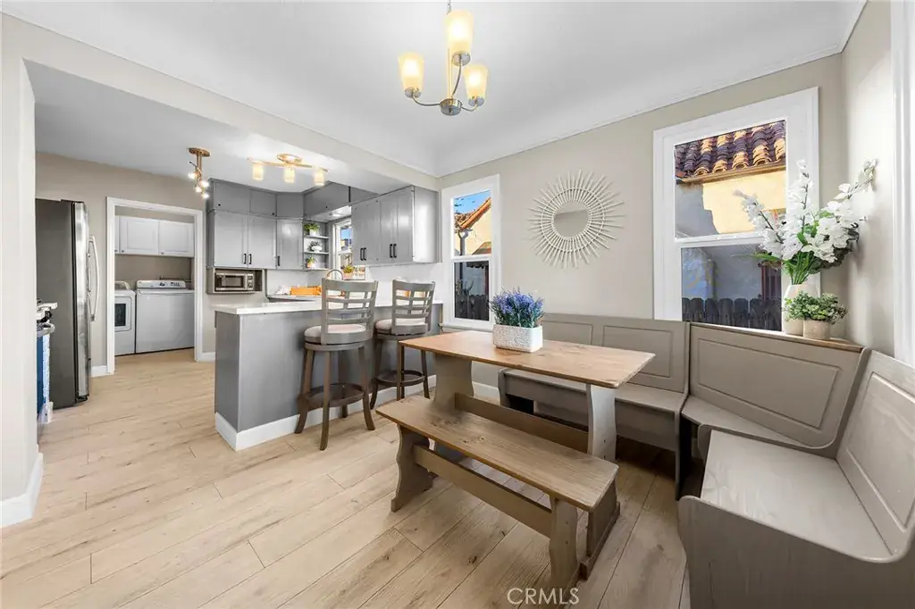 The well-appointed kitchen includes a new stove, motion-sensor vent hood, refrigerator, and a cozy breakfast nook. Additional highlights include an individual laundry room and a charming built-in hallway workstation, perfect for remote work or study.