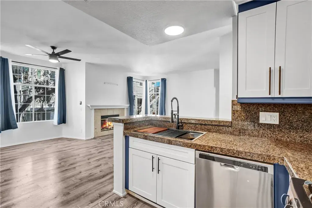Welcome to Canyon Villas! This light-filled, 1-bedroom, 1-bathroom end-unit offers an elevated living experience. Featuring dramatic vaulted ceilings and an open-concept floor plan, the home feels incredibly spacious and airy. The inviting living room, centered around a cozy fireplace, flows seamlessly into a dining area and a modern kitchen complete with granite countertops, stainless steel appliances, a newly installed farmhouse sink with cutting board, black faucet, and adjustable LED kitchen lights, and shaker style white cabinets. The bathroom has been renovated with brand new shaker-style cabinets, new large-sized soak-style bathtub with tile enclosure, black shower head and faucets, and new light fixtures. The unit has been repainted throughout. New shaker-style doors have been installed in the bedroom and bathroom. Brand new ceiling fans have been installed in the living room and bedroom.