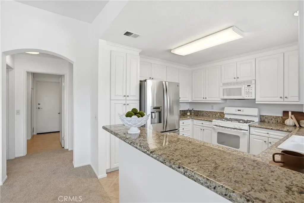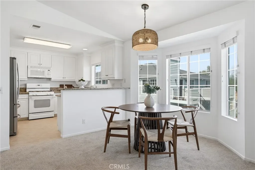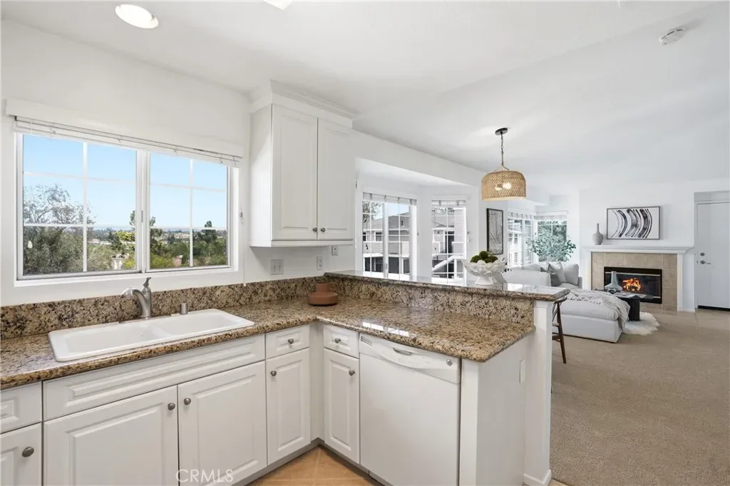 Spectacular mountain and city light views, abundant natural light, an open-concept floor plan, and a quiet location define this Aliso Viejo condo, creating a bright and inviting living environment with a wonderful sense of privacy and elevation. The main living area captures scenic views and a spacious feel, with an open layout designed for both everyday living and entertaining, while thoughtfully placed windows bring in natural light throughout the day. The interior features new carpet, freshly painted walls, and updated lighting accents, offering a clean, move-in-ready space with a neutral palette The kitchen includes granite countertops, ample cabinetry, generous storage, and a stainless steel refrigerator, with a layout that connects seamlessly to the main living area, making it ideal for daily living and gatherings while also capturing beautiful mountain views from the kitchen window. The bedrooms offer large closets, providing comfortable living space and functional storage. Positioned on the top level, the home benefits from added privacy, reduced noise, and elevated mountain views while maintaining a practical single-level layout. Just outside the front entry, a private balcony offers an additional outdoor space to enjoy fresh air and surrounding views, creating a quiet retreat separate from the main living area. A newer A/C unit installed in 2025 adds efficiency and year-round comfort. The home also includes a shared interior stair access leading to the garage level providing convenient covered access to your one-car garage and an assigned parking spaced for ease of living and everyday convenience. Community amenities include multiple pools and spas, clubhouses, a fitness center, and well-maintained greenbelts and open spaces. Ideally located near Aliso Viejo Town Center, shopping, dining, parks, and nearby hiking and biking trails, with Laguna Beach and coastal destinations just a short drive away, this home offers an exceptional combination of light, views, privacy, and convenience.
