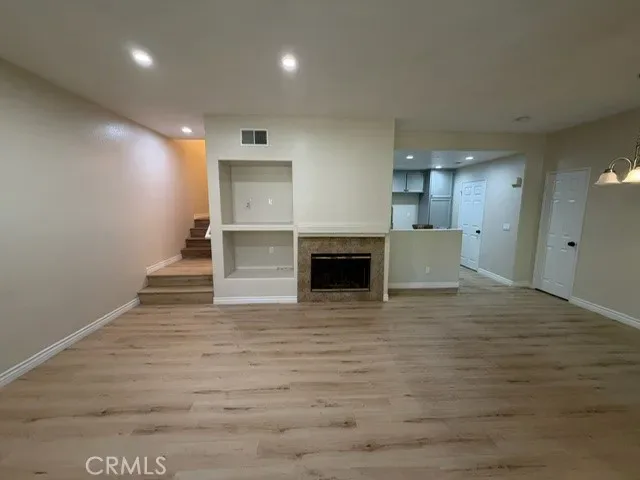 The home showcases a bright and airy open floor plan with high ceilings, a cozy fireplace, and seamless indoor-outdoor flow to a private patio—ideal for relaxing or entertaining. Thoughtfully updated throughout, it features brand-new luxury vinyl flooring on the stairs and in both bedrooms, fresh interior paint, upgraded cabinetry, modern recessed lighting, and updated fixtures that create a warm and inviting ambiance.