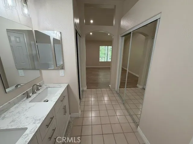 Upstairs, you’ll find two well-appointed bedrooms, including a primary suite with vaulted ceilings, dual mirrored closets, and an en-suite bathroom featuring a dual vanity with updated sinks and fixtures, as well as a separate water closet. The secondary bedroom is generously sized and includes its own closet, offering flexibility for a variety of uses. A well-appointed full bathroom is conveniently located just next to the second bedroom, providing excellent functionality and comfort.