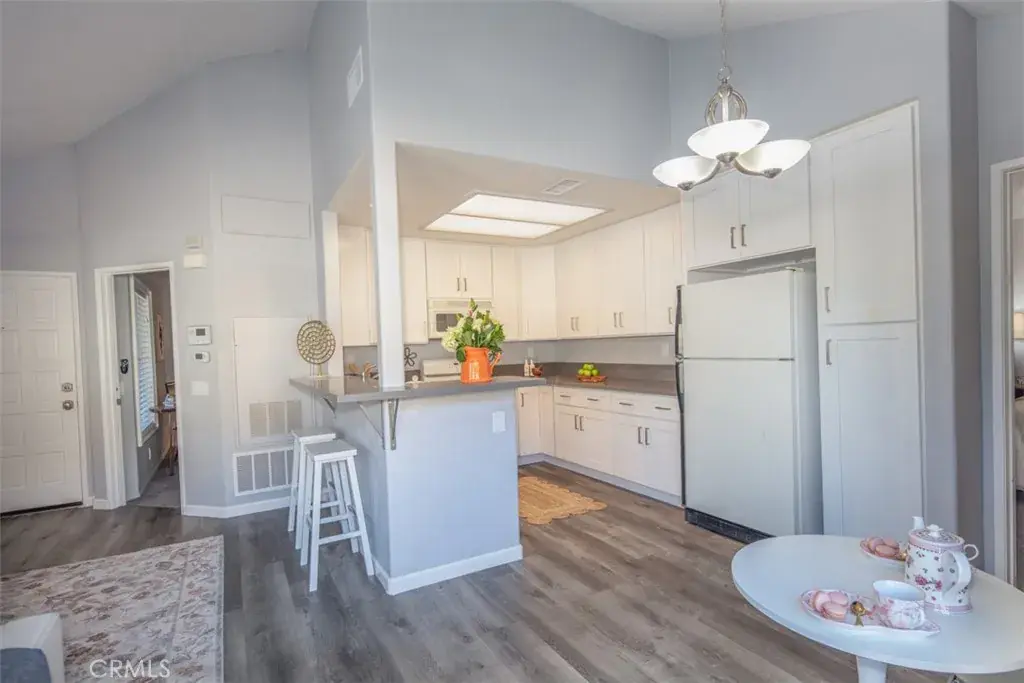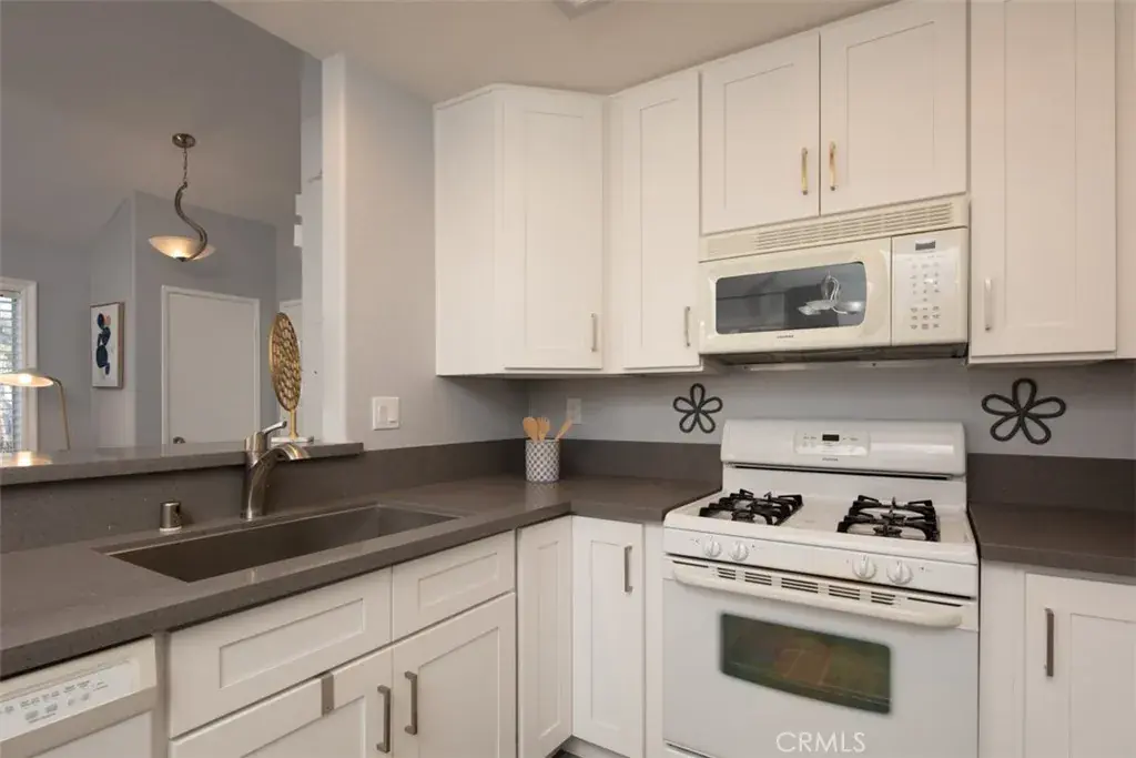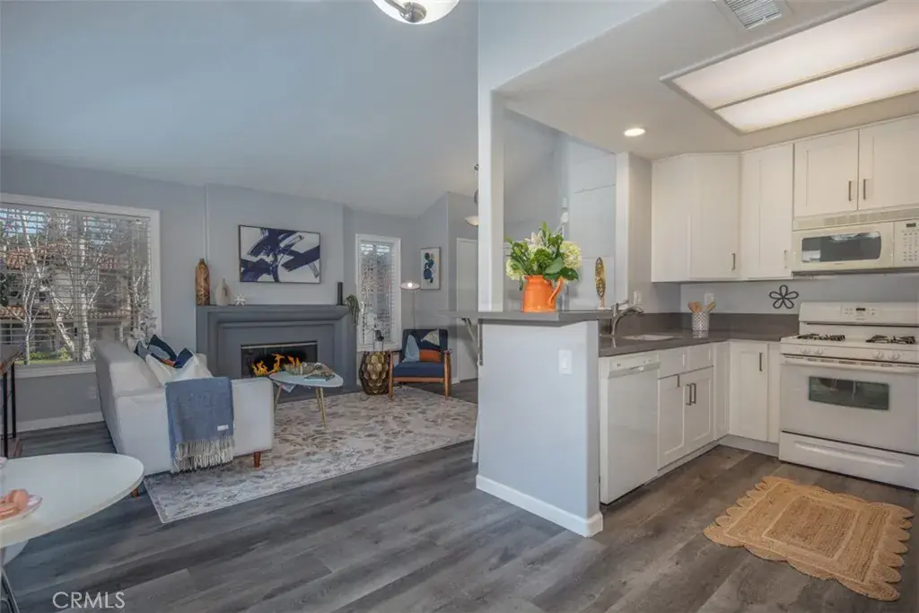 Resort-like living in this light and bright upper corner end-unit condo. Be greeted with the flood of natural light and vaulted ceilings in this thoughtfully designed space. Remodeled kitchen with white cabinets, granite countertops, and a breakfast bar that overlooks the living room with vaulted ceilings, windows on every wall, and a gas fireplace.
