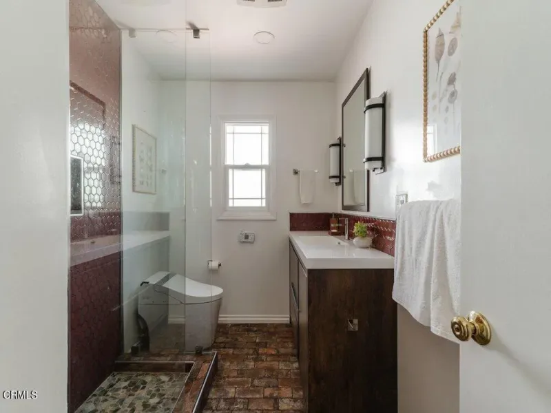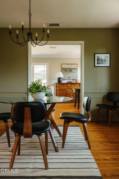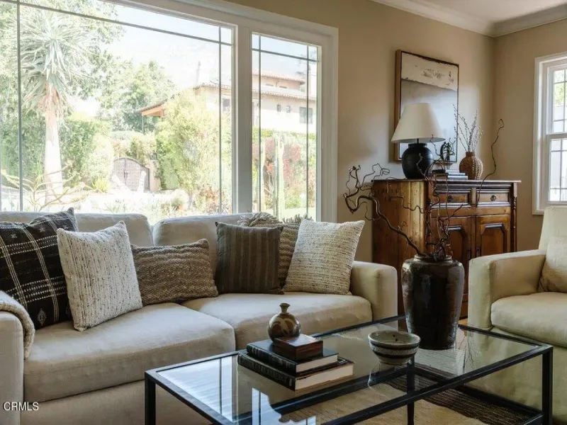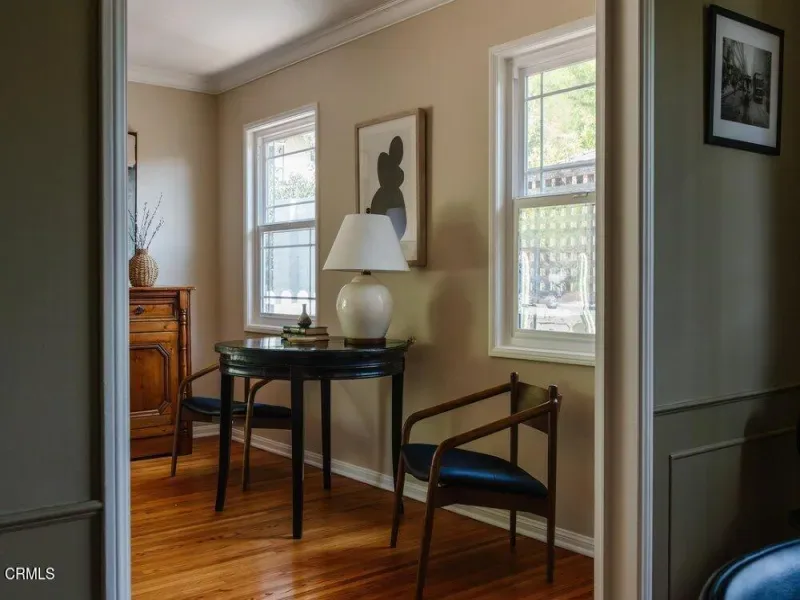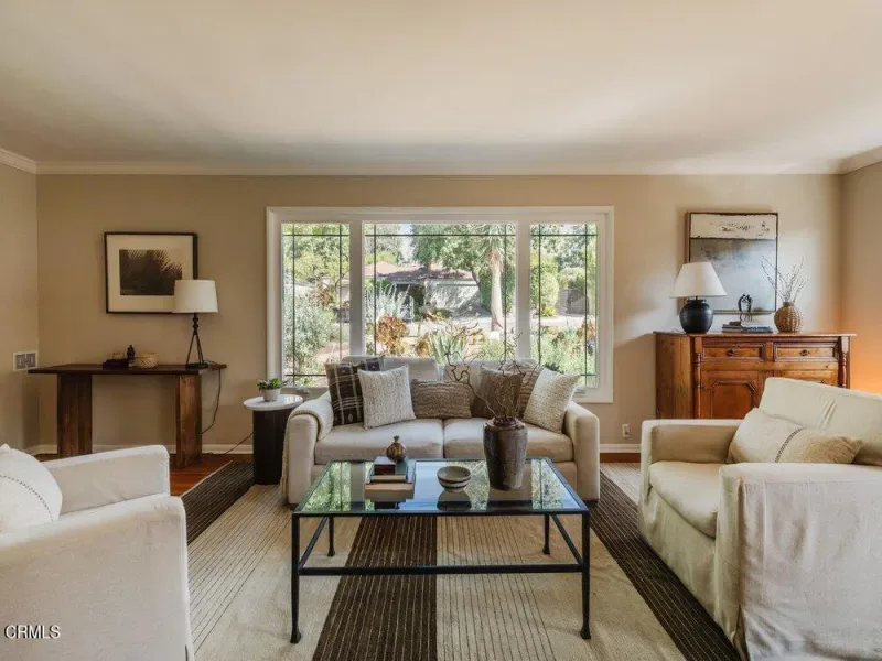 This graceful Traditional home is nestled in a quiet neighborhood close to the Altadena golf course. Inside, enjoy a bright living room with an elegant picture window, a floor-to-ceiling brick fireplace, and gleaming hardwood floors. The formal dining room embellished with wainscotting leads to both the family room & kitchen. Take in the lush backyard through the expansive corner window in this stylish kitchen with navy cabinets, Bianco Carrara countertops & rustic Saltillo tile floors. The spacious family room features yet another fireplace & French doors that open to the outdoors, creating a seamless indoor-outdoor transition. Three spacious bedrooms & two bathrooms complete this comfortable floorplan. The main bathroom has been redesigned with a large vanity & dramatic finishes. Outside, the deck is complete with a convenient BBQ area, ideal for entertaining. The backyard has been lovingly landscaped to feel like a private oasis. Meander down the path to a shaded pergola where you can relax & enjoy the abundant greenery & stunning pond. And tucked just behind the garage is a wonderful office space measuring 222 sqft!