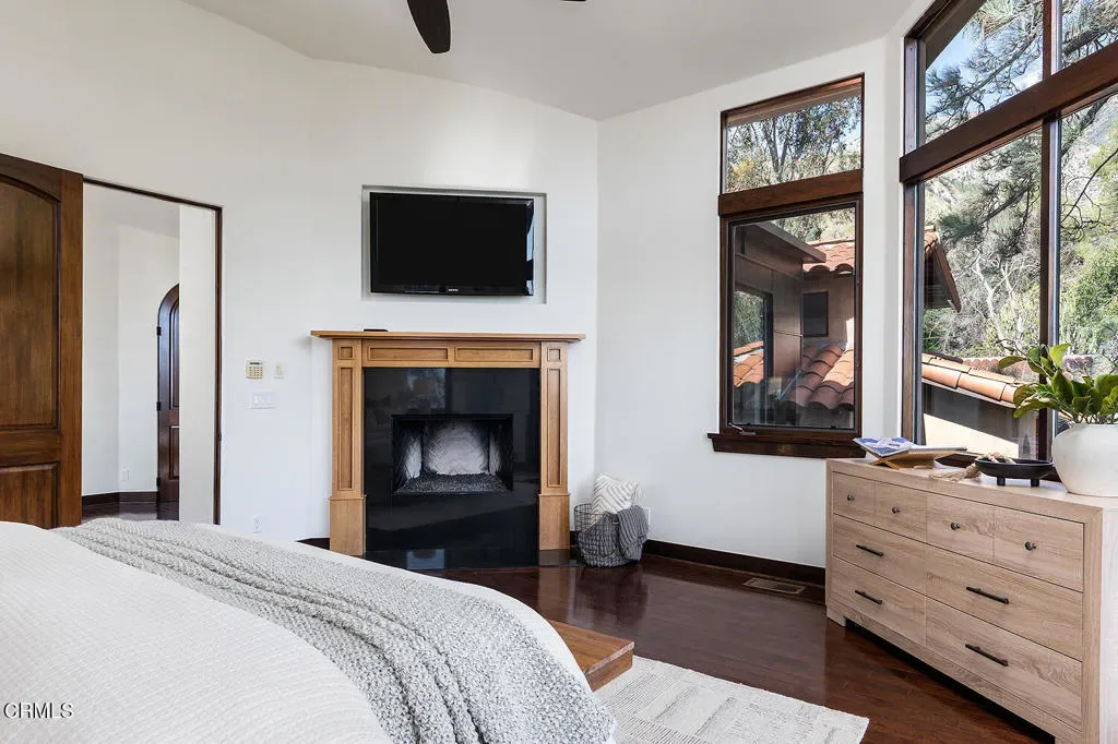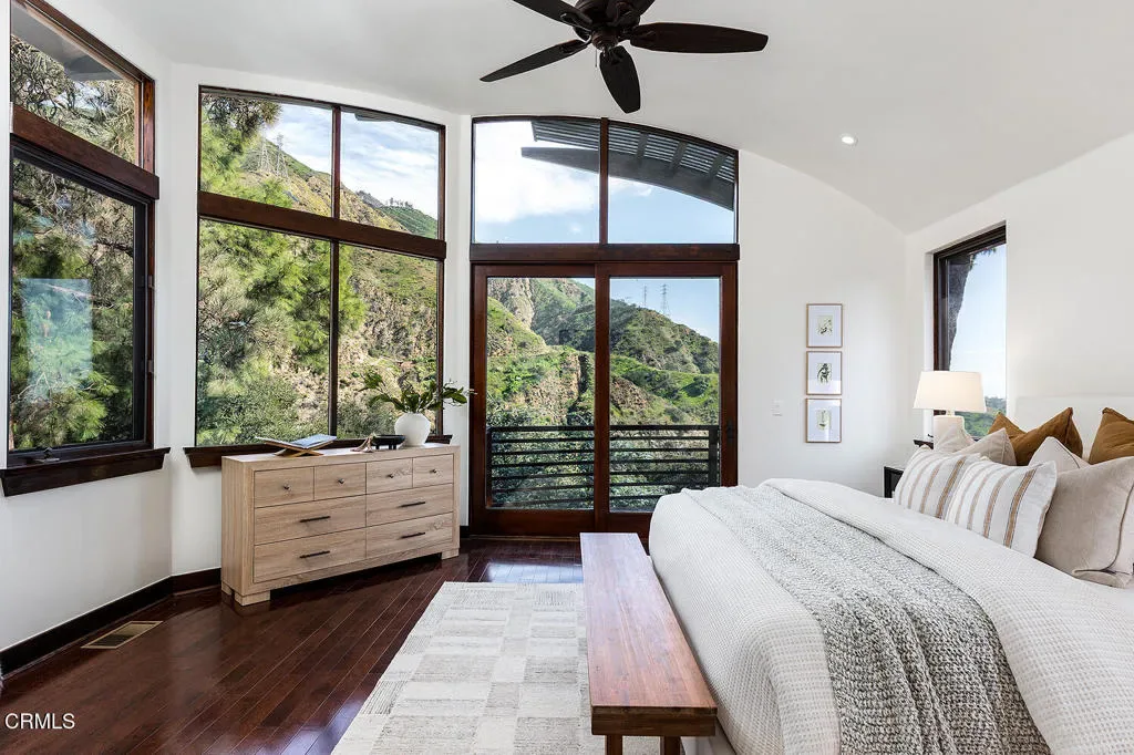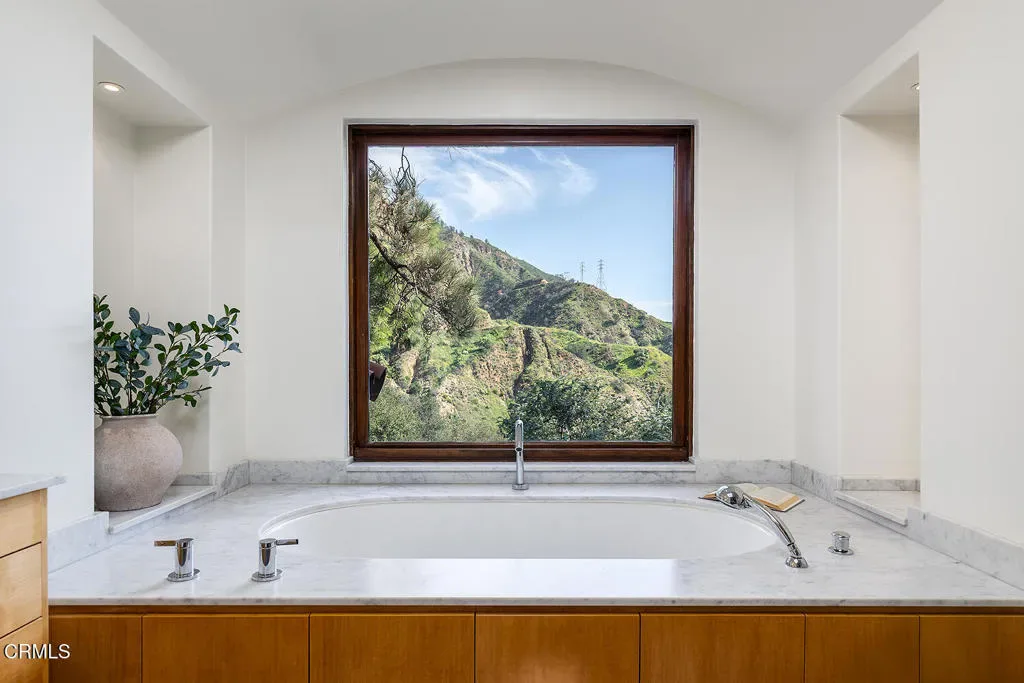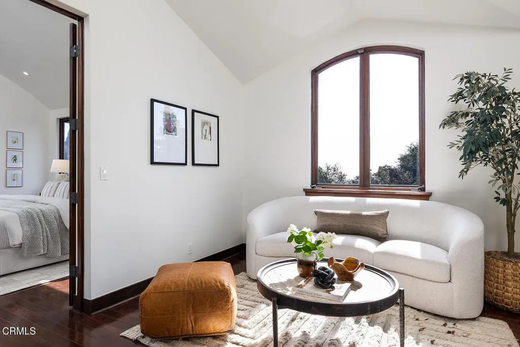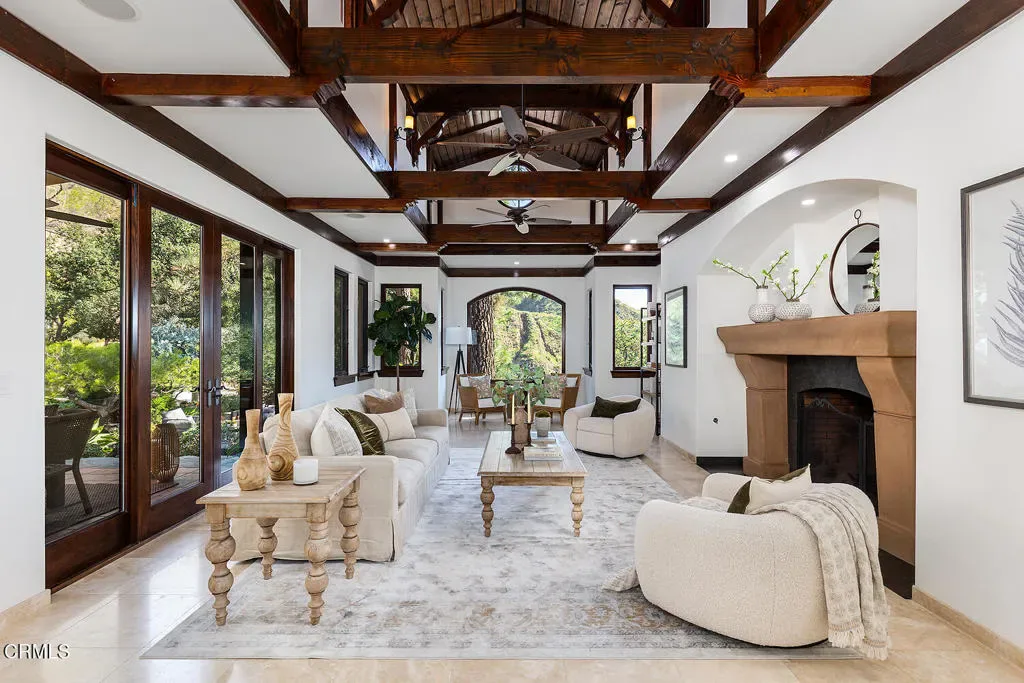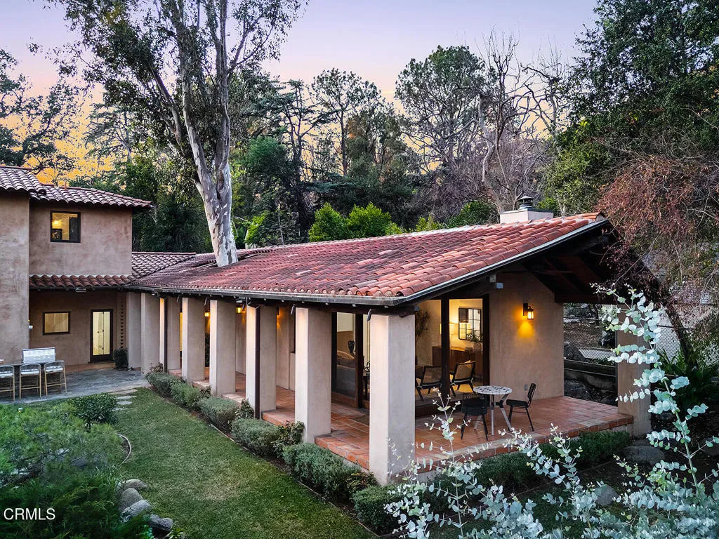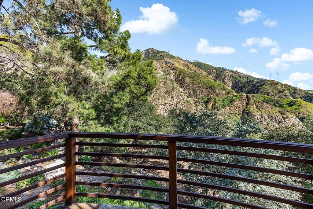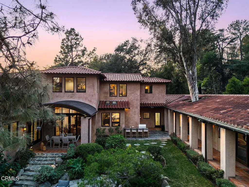 Nestled in the foothills of Altadena, this gated California Mediterranean Estate is a masterwork of architectural design and premium craftsmanship. Set on an expansive, private lot, the property was built in 2009 and offers a seamless connection to nature with dramatic panoramas spanning mountains, treetops, and lush green surroundings. The residence is defined by exceptional finishes, including recurring arches, open wood-beamed and trussed ceilings, and custom wrought-iron work. The dramatic two story entry with grand staircase and wood paneled ceiling is adjacent to the wood-paneled library with fireplace. The formal living room boasts travertine floors, rich wood beams, stone fireplace mantle, picturesque windows and sliding doors to the covered patio. The formal dining room features seamless hand-plastered barrel ceilings and sliding glass doors. The heart of the home is the gourmet kitchen with a large island and breakfast nook that flows effortlessly to outdoor verandas and a built-in barbecue. Steps down to a comfortable family room with travertine floors and two sets of sliding doors accessing the backyard and side yard to a basketball court. The main residence features five bedroom suites, highlighted by a secluded primary retreat occupying its own level to maximize the breathtaking views, balcony, fireplace and sitting room. The upper level consists of a dedicated secondary wing featuring its own den. There are two laundry rooms on each level for maximum convenience. Designed for grand-scale entertaining, the grounds feature covered verandas, lush landscaping, and a vast lower-level yard for all recreational events. A full guest house provides a private sanctuary for visitors, complete with vaulted wood ceilings, a fireplace, a kitchenette, and a full bath. Two separate garages offer ample storage to complete this unparalleled canyon-side estate. This property is close to award winning restaurants like Betsy, Prime Pizza, Miya and more!