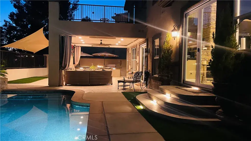 Nestled within the esteemed community of Belsomet, A sought after privately gated community, stands this prestigious home, which has been artfully transformed into an entertainment dream. Private cul-de-sac location. Spanning over 4250 sq ft, plus 500 sq ft of outdoor living this residence boasts office/bedroom plus 5 large bedrooms, two main floor bedroom and 3 .5 bathrooms, walk in closet, upstairs loft area. Travertine and wood flooring throughout, soaring ceilings light up with crystal chandelier and accent lighting throughout. Every detail, from the custom wrought iron double door entrance to the beautiful wrought iron staircase, reflects a commitment to timeless elegance and refined luxury. The kitchen, a culinary experience with ample cabinet space, walk in pantry, large laundry room with plenty of storage, countertop granite tops throughout has undergone a complete transformation and provides an inviting space for both cooking and congregating. Multiple gathering and entertainment spaces with family room and full wet bar right off the family room, huge living room that beckons you with its fireplace. The primary suite boasts a walk-out terrace, large suite, and generously sized walk-in closet. Upgraded tankless water heater. Central HVAC. Step outdoors onto an entertainer’s beautiful back yard, boasts enclosed area with heaters, BBQ island with firepit and a SOLAR heated pebble pool and spa which is salt water! Truly captivating and absolutely great for entertaining or just relaxing. This one has it all!