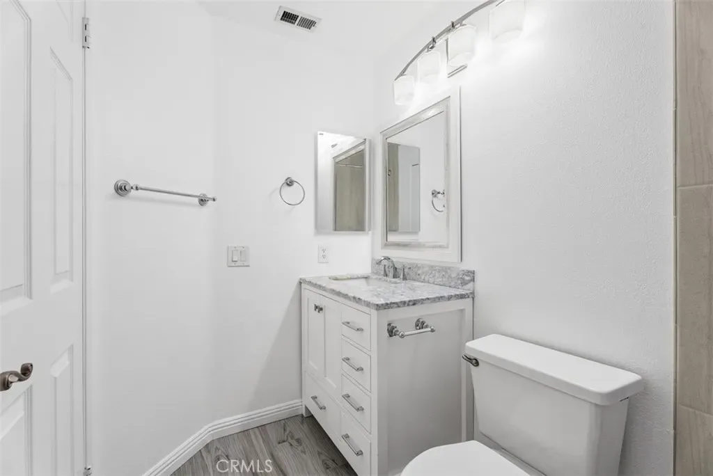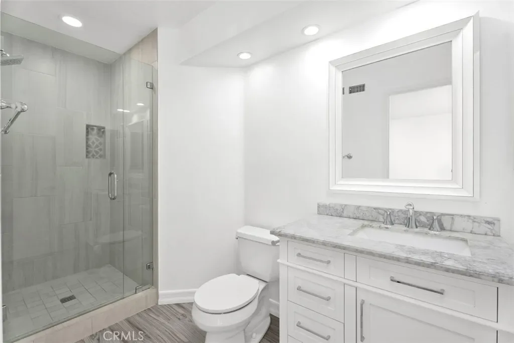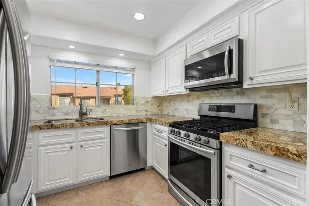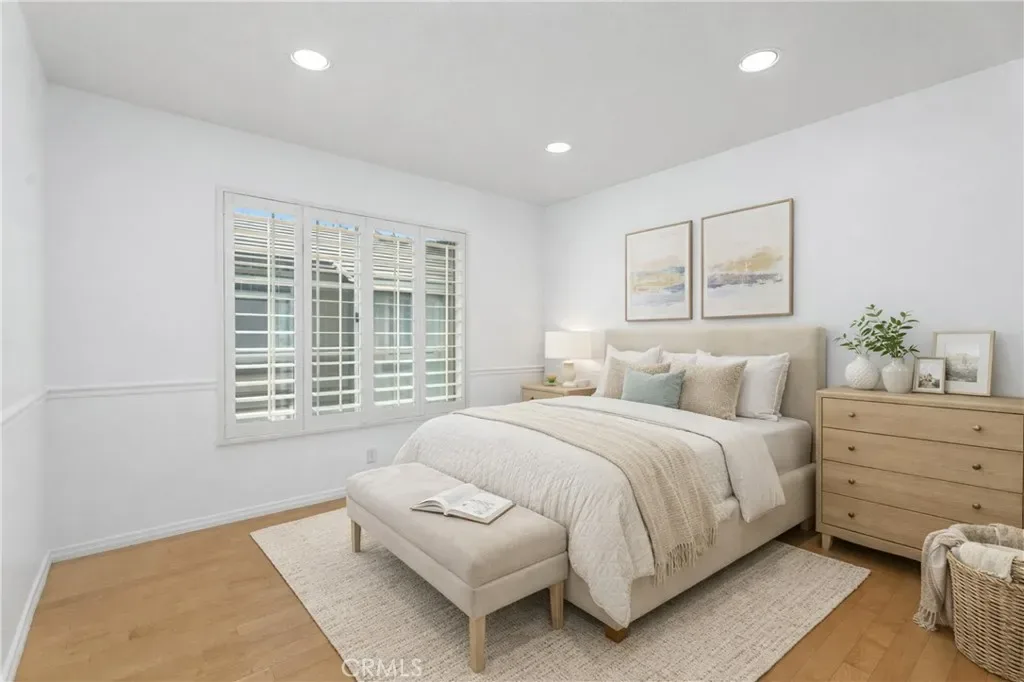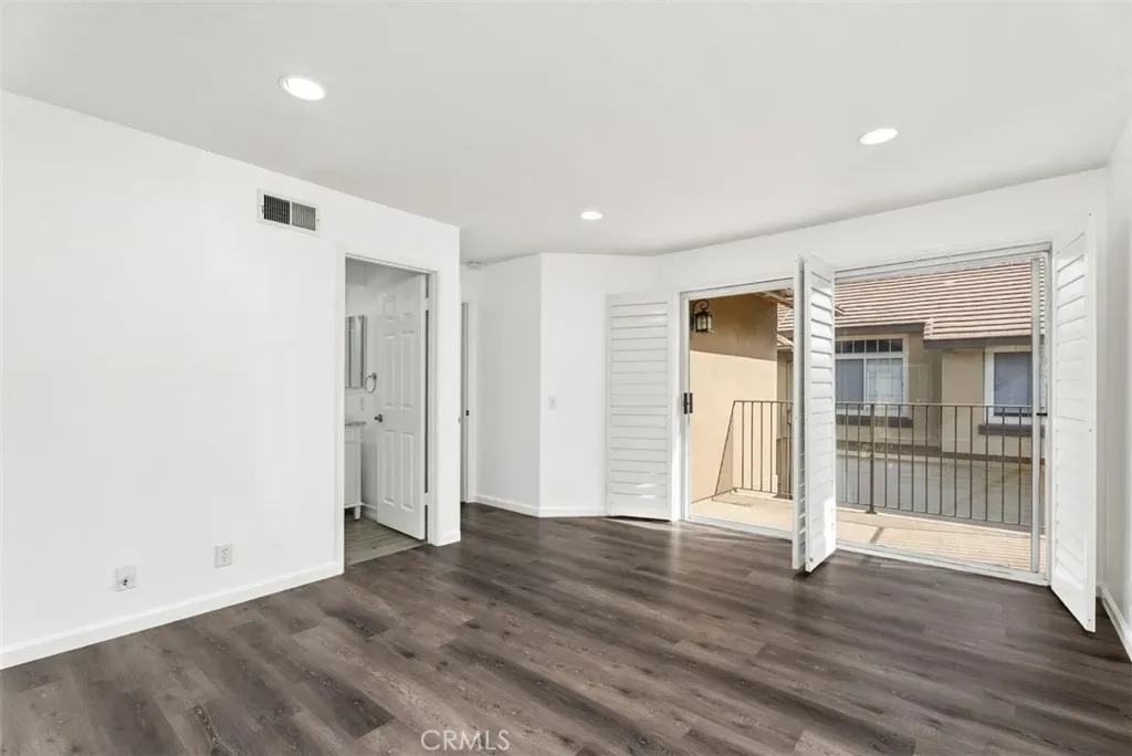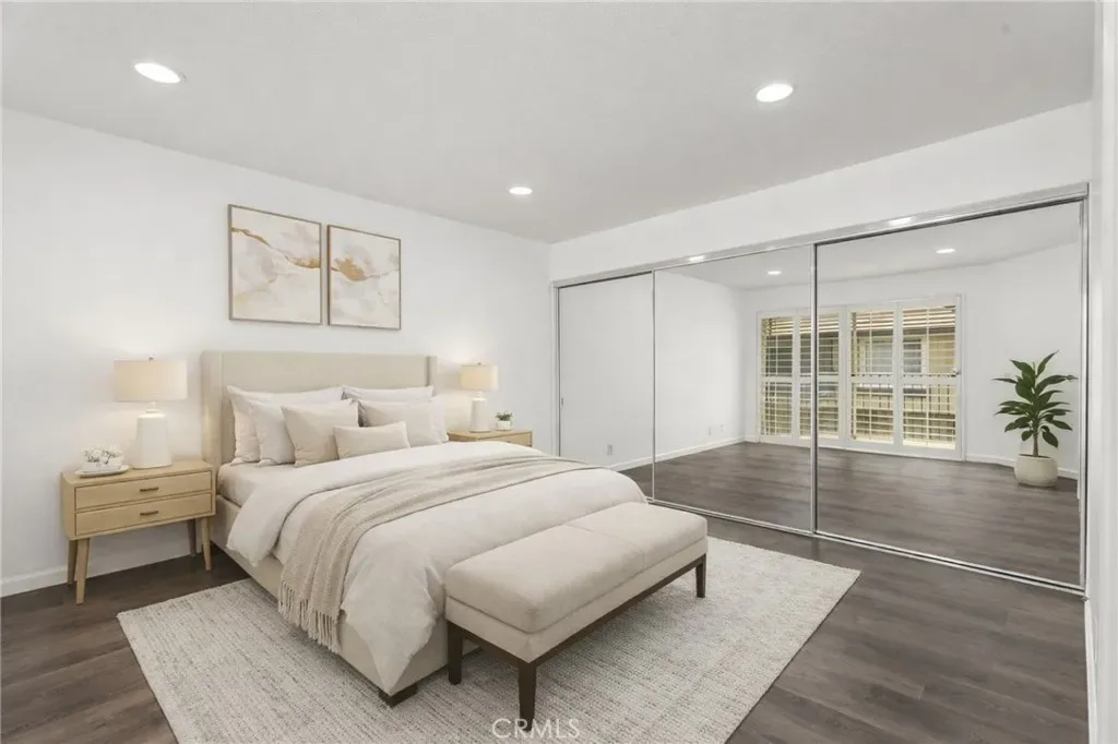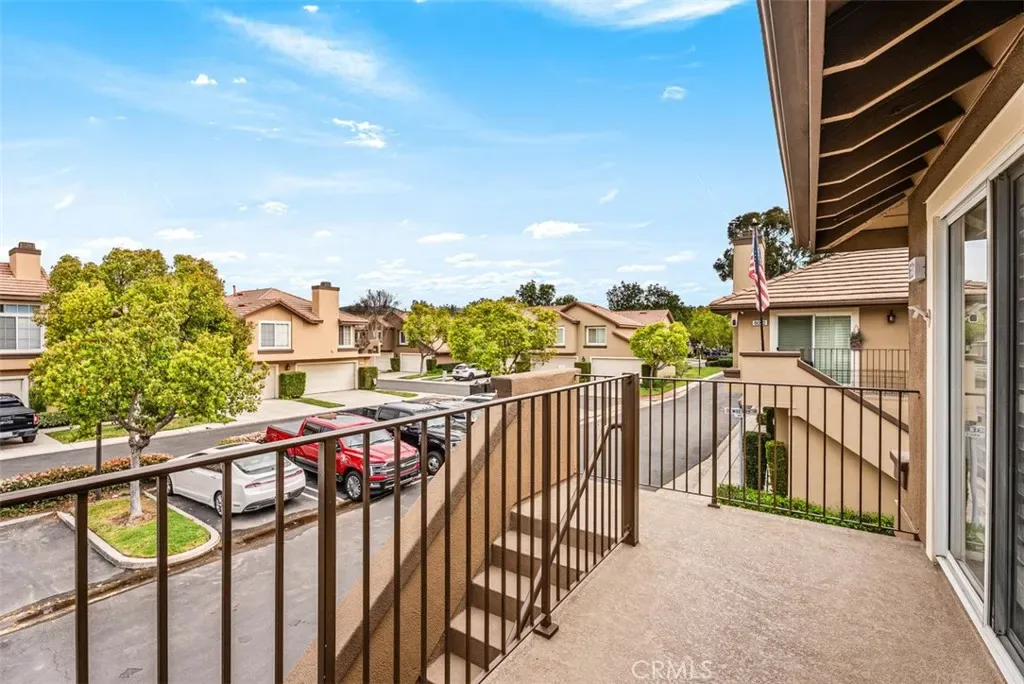 The primary suite serves as a relaxing retreat with a remodeled bathroom. Step outside to your private balcony, perfect for morning coffee or relaxing in the Southern California breeze.