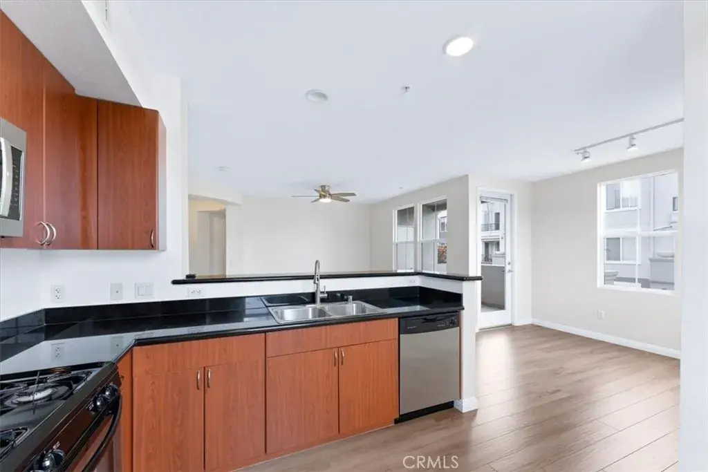 Fully remodeled third-floor Stadium Loft in Anaheim’s Platinum Triangle! This rare Yankee floor plan—one of only eight—offers a desirable corner-unit layout with an inviting circular entry. The open kitchen features granite countertops and stainless-steel appliances, flowing into the living and dining areas. Enjoy one of the largest balconies in the community and a split-bedroom design for added privacy.