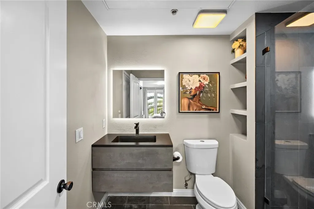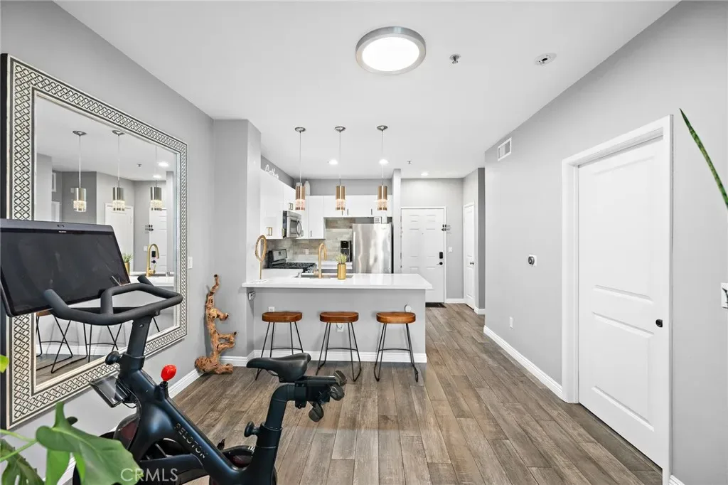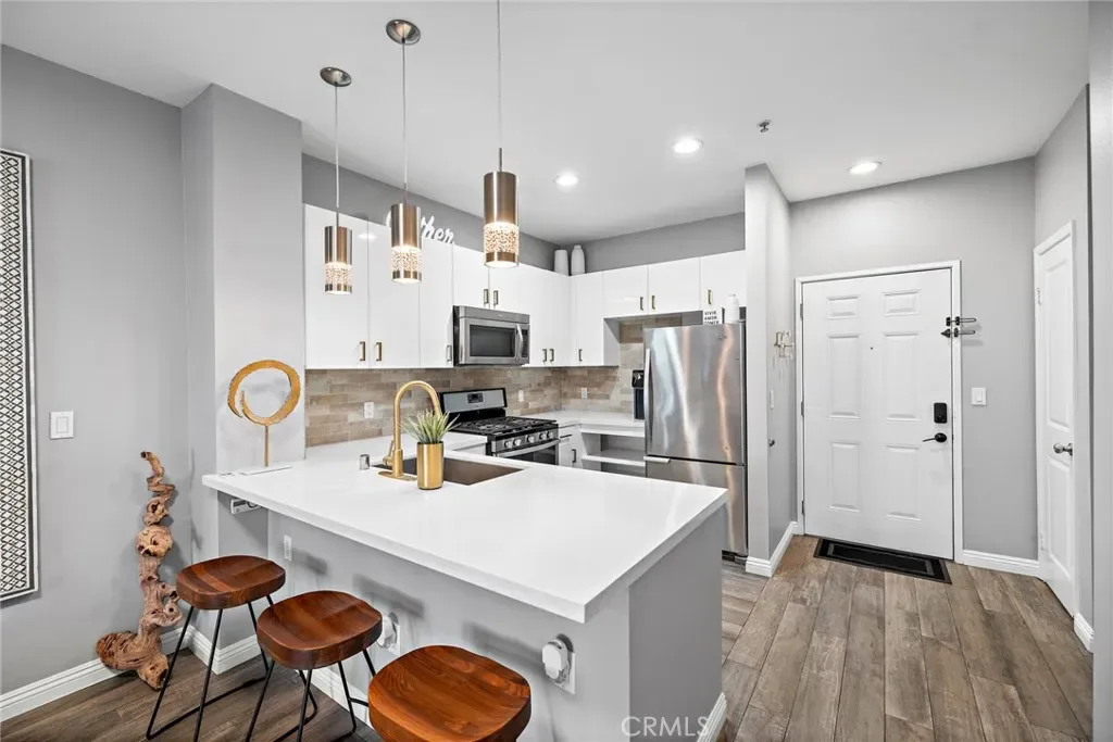 BIG PRICE ADJUSTMENT FOR TOTALLY REMODELED CONDO! ACT FACT! Platinum Triangle! OC Vibe! Top Floor! City View! Two Parking Spaces! Extra Storage Room! Stunning condo where elegance meets convenience. This home has wonderful city views and boasts prime access to parking, an elevator, and storage, making it a true gem in the community. This unit comes with two parking spaces and a storage room. Step inside this delightful 784 square foot home, adorned with exquisite porcelain flooring that flows seamlessly throughout. The living space is bathed in nourishing natural light from large glass French doors that invite you to unwind on your private balcony. Enjoy evenings in your cozy living area, equipped with a large flat-screen TV, offers a perfect spot for relaxation. The modern kitchen features sleek white high-gloss cabinets with stylish brass hardware, a state-of-the-art pull-down brass faucet, and quartz countertops with elegant bar seating illuminated by beautiful LED pendant lights. With newer stainless-steel appliances and a new garbage disposal, every meal can be crafted with ease. Retreat to the spacious primary bedroom, designed for comfort with ample space for a king-sized bed. Revel in the grandeur of a lovely hanging light fixture and a generous walk-in closet that caters to all your storage needs. The updated bathroom features an updated sink with a touch-sensitive lighting mirror, Alexa speaker, a glass walk-in shower adorned with a stone mosaic floor, and Italian slate tiles. This home is complete with an efficiently designed laundry closet, accommodating new full-sized washer and dryer, and new shelving for perfect organization witth new tempered glass doors giving it a classy look. The entire home is freshly painted and impeccably cleaned, this residence is move-in ready! Enjoy the amenities of the Stadium Lofts Community including Water, Trash, Free Wi-Fi, AMPLE GUEST PARKING, Electric Car Charging, clubhouse, a sparkling pool and spa, a fully equipped gym with a Peloton room, a sauna, indoor lounges, and outdoor BBQ areas perfect for entertaining. Enjoy the vibrant local lifestyle, with top attractions like Angel Stadium, The Grove, Disneyland, and the Honda Center all at your doorstep, along with a plethora of dining and shopping options. Convenient freeway access to the 5 and 57 freeways ensures that everything you need is close to home. Do not miss the chance to call this exquisite abode your home!