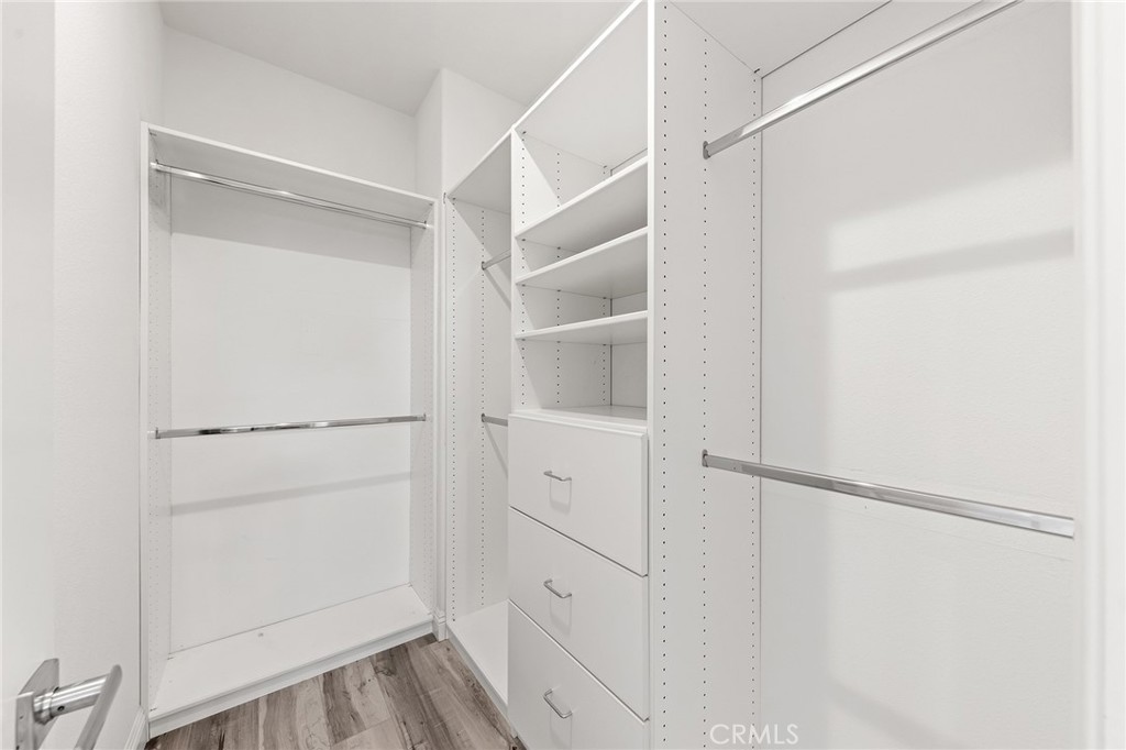 The primary suite includes a large bedroom area and an en-suite bathroom with dual vanities, a soaking tub, and a separate shower. All closets throughout the home have been upgraded with built-in cabinetry, shelving, and drawers for improved organization and storage.