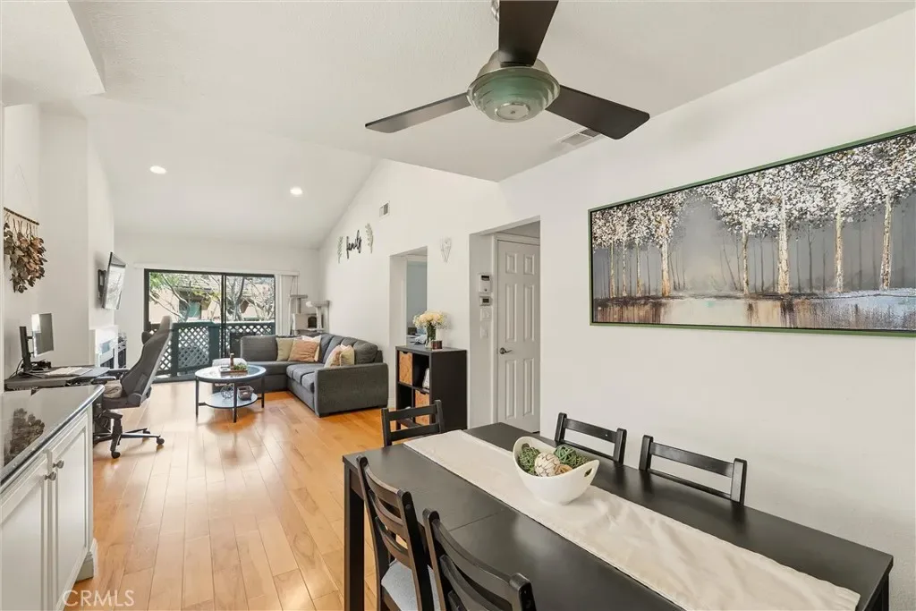 Welcome to this beautiful cozy well-maintained 2-bedroom, 2-bathroom condo located in the desirable Evergreen Village community in West Anaheim. This inviting home features modern kitchen surfaces, and vaulted ceilings that create a bright and open living space.