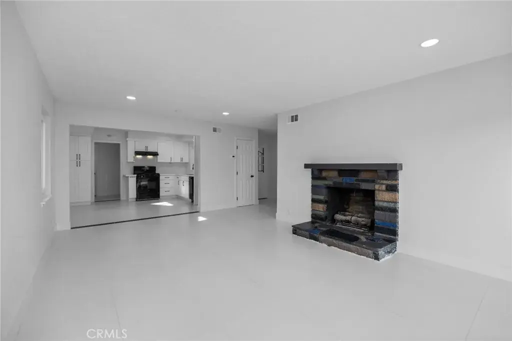 Step inside to an open, light-filled floor plan featuring new flooring throughout, recessed lighting, and a spacious living area anchored by a charming fireplace. The home flows seamlessly into the brand-new kitchen, complete with white shaker cabinetry, new quartz countertops, a deep farmhouse sink, new stainless steel appliances, and sleek black hardware—perfect for both daily living and entertaining.
