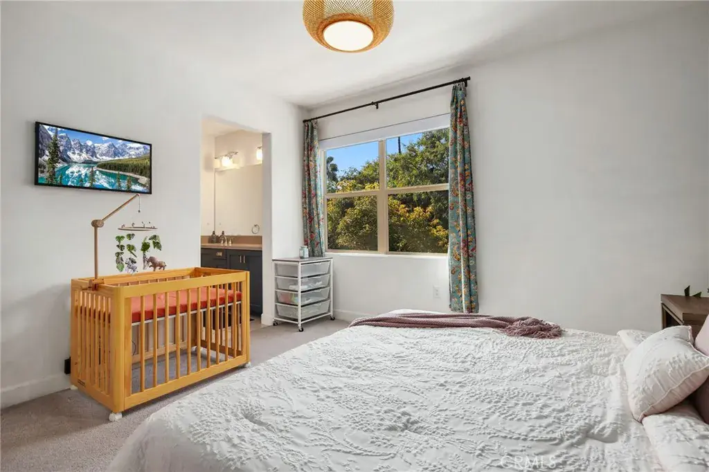 A stunning three-bedroom condominium located in the sought-after Domain community which is situated within close distance of Anaheim’s Historic Packing District. The interior features an open-concept floor plan characterized by abundant natural light and high-end finishes, including wood-look tile flooring, designer lighting, and recessed lights throughout. The spacious kitchen is equipped with quartz countertops, a custom backsplash, stainless steel appliances, and a generous island overlooking the entertainment area and private covered balcony. As a comprehensive smart home, the property includes integrated lighting, smart blinds in the primary suite, and direct 2 car garage access. The primary suite offers a secluded ensuite with dual sinks, a separate tub and shower, and a walk-in closet. The additional bedrooms feature custom upgrades, including a shiplap accent wall and built-in cabinetry. Further enhancements include: Finished two-car side-by-side garage with epoxy flooring, custom cabinetry, and extra storage/workout space. Two EV chargers and a tankless water heater. Salt-free water softener and filtration system. Upgraded laundry room with a folding station. Residents of The Domain enjoy secure gated access to premium amenities, including a resort-style pool, outdoor fireplaces, picnic areas, and a private rooftop lounge with views of the Disneyland fireworks. Plus HOA includes free internet of 1GBPS. Its central location provides convenient access to local freeways, public transit, and major attractions such as Disneyland, the Honda Center and Angels Stadium.