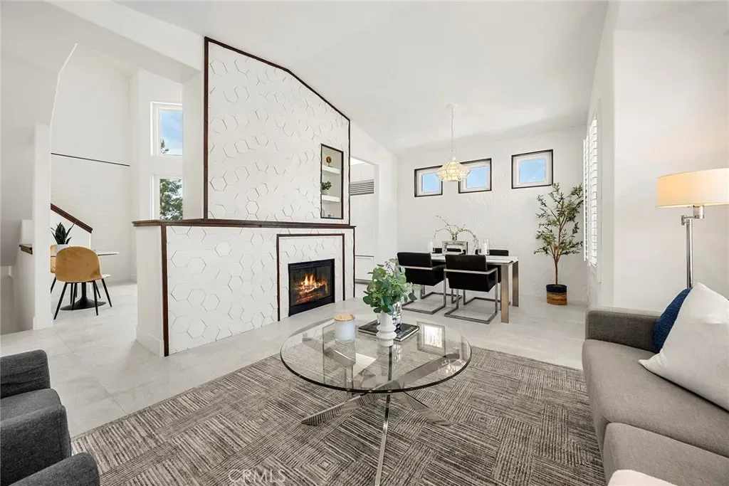 Welcome to a true designer’s showcase in the highly sought-after Monaco community of Anaheim Hills. This exceptional residence has been thoughtfully upgraded with a level of detail and sophistication rarely found in homes of this caliber. From the moment you step inside, you’re greeted by stunning porcelain tile accent walls and a striking fireplace surround that serves as a centerpiece of the living space. Every element has been curated to create a modern yet inviting atmosphere. The gourmet kitchen is a standout, featuring premium Viking appliances—including a 5-burner range, microwave, and dishwasher—paired with a Sub-Zero refrigerator. Quartz countertops, a convenient breakfast bar, and an adjacent dining nook make this space perfect for both everyday living and entertaining. Step outside to the private patio to enjoy tranquil views of trees and open sky—an ideal setting for morning coffee or evening relaxation. The main level offers two bedrooms, including a luxurious primary suite designed with comfort and style in mind. The spa-inspired primary bath features a spacious walk-in shower, dual sinks set in elegant stone countertops, a private water closet, and a generous walk-in closet. A beautifully updated hall bath continues the home’s cohesive design with high-end finishes and a custom walk-in shower. Upstairs, a versatile loft functions as a third bedroom or private retreat, complete with its own well-appointed bathroom and ample closet space. Bamboo flooring extends throughout both levels, complementing the home’s upscale aesthetic. As an end unit, the home is filled with natural light, enhancing its open and airy feel. Additional highlights include a two-car attached garage, a full driveway for extra parking, and close proximity to the community pool—perfect for enjoying warm Southern California days. This is a rare opportunity to own a truly turn-key, designer-upgraded home in a prime location. Don’t miss your chance to experience it for yourself.