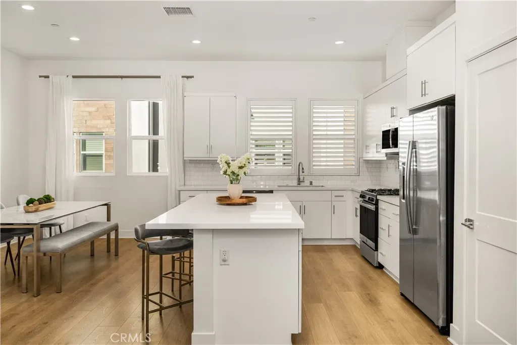 Built in 2019, this beautifully designed three-level townhome blends modern style with warm, inviting spaces that feel instantly like home. Thoughtfully laid out for both comfortable living and effortless entertaining, every level offers something special. The main living floor welcomes you with a bright, open-concept layout where the living room, dining area, and kitchen come together in a seamless space filled with natural light. The kitchen is a true centerpiece, featuring crisp quartz countertops, sleek self-closing cabinetry, and an oversized island perfect for gathering with friends, hosting dinners, or enjoying your morning coffee. The clean, all-white design gives the space a timeless, fresh feel that pairs beautifully with the durable vinyl flooring that runs throughout the home. Upstairs, the generous primary suite feels like a peaceful retreat, offering a spacious walk-in closet, expansive dual vanity, walk-in shower with beautiful designer tile flooring, and a private toilet room for added comfort. The 2nd bedroom completes the upper level, with ample space and an en-suite bathroom, making it perfect for visitors or multigenerational living. The first level offers a private work-from-home office space, ideal for remote work, a reading nook, or a creative studio. Just steps away is the attached two-car garage with well-maintained concrete flooring, providing both convenience and a polished finish. Central heating and air conditioning keep the home comfortable year-round. Outside your door, the community offers inviting shared spaces including a sparkling pool, BBQ area, and a children’s playground, creating the perfect setting for relaxing weekends and neighborhood gatherings. With easy freeway access and close proximity to shopping, dining, and everyday conveniences, the location makes daily life simple and connected. Stylish, welcoming, and designed for modern living, this home offers comfort, character, and the perfect place to entertain.