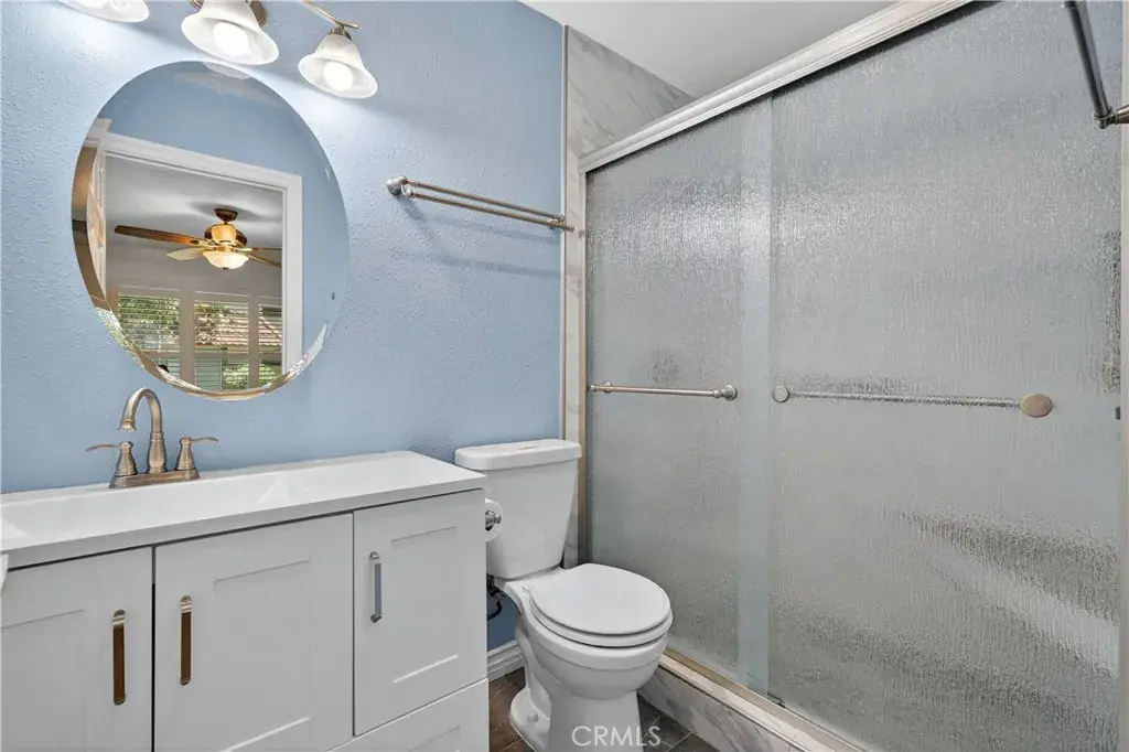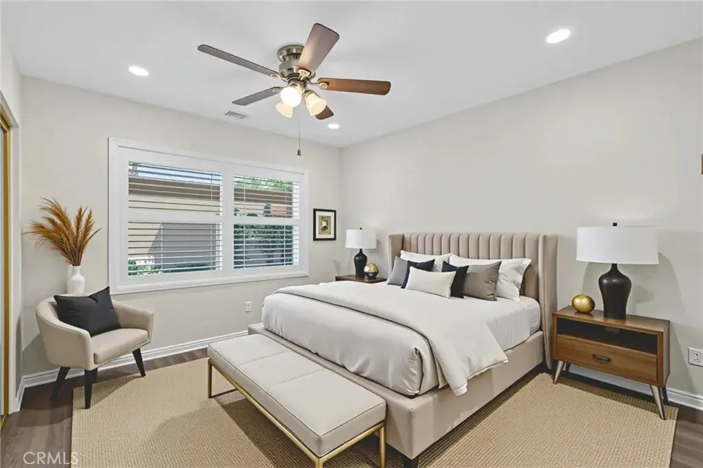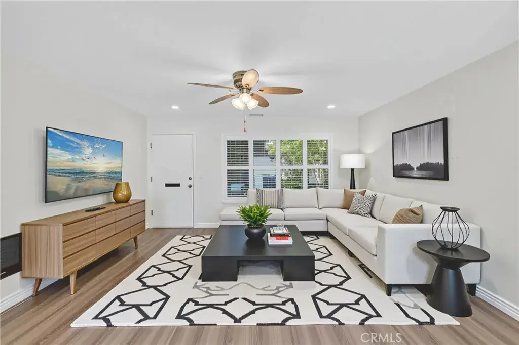 RECENTLY REMODELED SINGLE-FAMILY HOME ON A CORNER LOT, ATTACHED ON ONLY ONE SIDE, NO ONE ABOVE OR BELOW, WITH PATIO ACCESS TO 2-CAR GARAGE! Open floor plan and large windows, all with plantation shutters, bring in lots of natural light. Living room is open to dining room, and dining room is open to remodeled kitchen with recessed lighting, quartz countertops, and stainless-steel appliances. Kitchen windows and sliding glass doors in dining room and one of the back bedrooms open to a large private back patio with wood fence and block wall, where you can relax and barbeque. Recently painted, and newer laminate flooring throughout except for carpet in primary bedroom. Large primary bedroom has ensuite full bathroom. Down the hall is a second full bathroom, and two additional bedrooms at the back of the home. Newer Central A/C and water heater, dual-pane windows, and smooth ceilings. Ceiling fans in all bedrooms, and recessed lighting in living room, dining room, kitchen and one of back bedrooms. Community has an association pool and spa, and is next to Boisseranc Park, a public park with lighted tennis courts, pool, handball courts, baseball fields, playground, and picnic area. Conveniently located near 91 and 5 freeways.