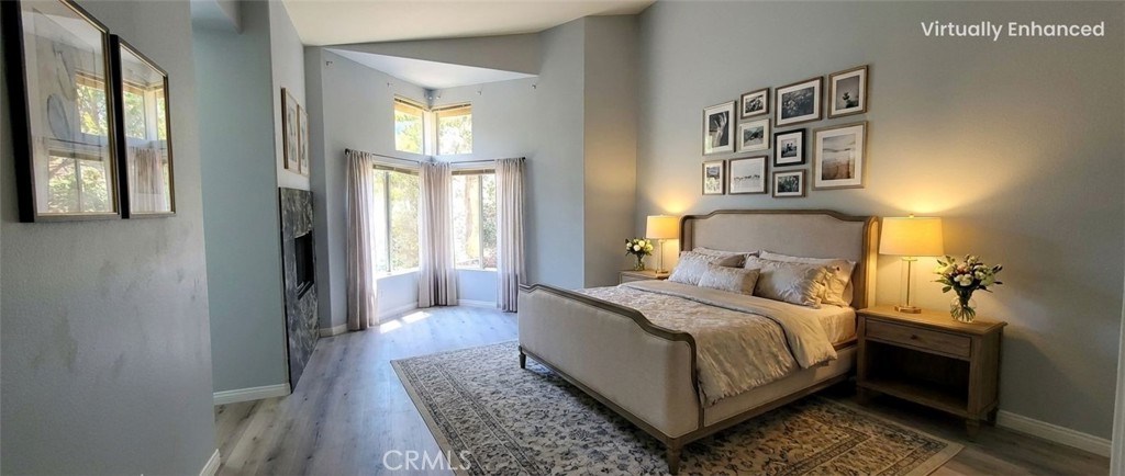 ** Upstairs nice open bridge between bedrooms, for complete privacy. On one side the primary suite with a fireplace and dramatic vaulted ceilings and vibrant windows overlooking lush landscaping from the backyard.