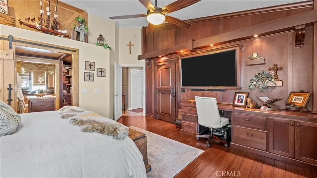 Additional features include travertine flooring in the main living areas, bamboo flooring in select rooms, crown molding, plantation shutters, Bohemian crystal chandeliers, a Pentair whole-home carbon filtration system, and 30 paid-off solar panels.