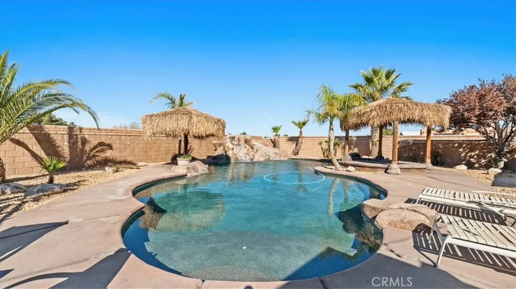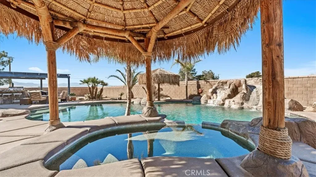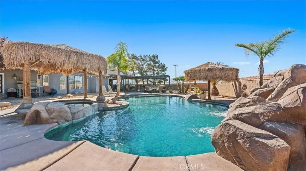 This 3 bed, 3 bath, 2,432 sq ft home has been thoughtfully upgraded throughout and designed for real use. The backyard is the centerpiece: a saltwater pool and spa with rock waterfall and slide, baja shelf, palapa-covered lounging areas, three covered patios (including a slate-tiled main space), and an outdoor kitchen built for everyday living and hosting. Solar thermal collectors help maintain pool temperature efficiently.