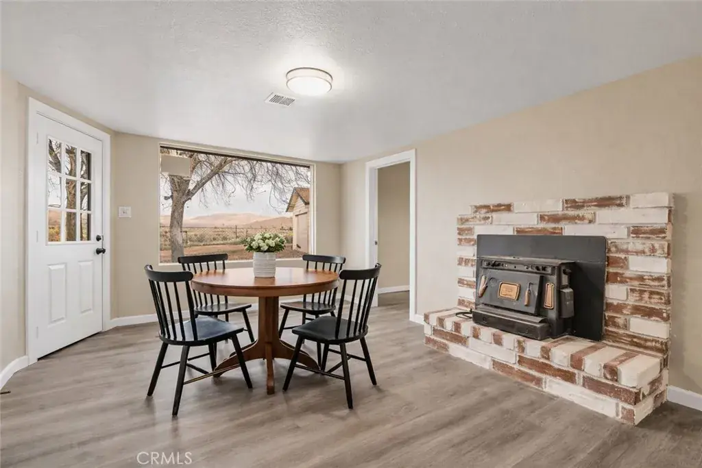 The inviting living room features a cozy potbelly stove, perfect for relaxing evenings, while an additional family room provides extra space for entertaining or everyday living. The bright kitchen showcases elegant quartz countertops, crisp white cabinetry, and stainless steel appliances.