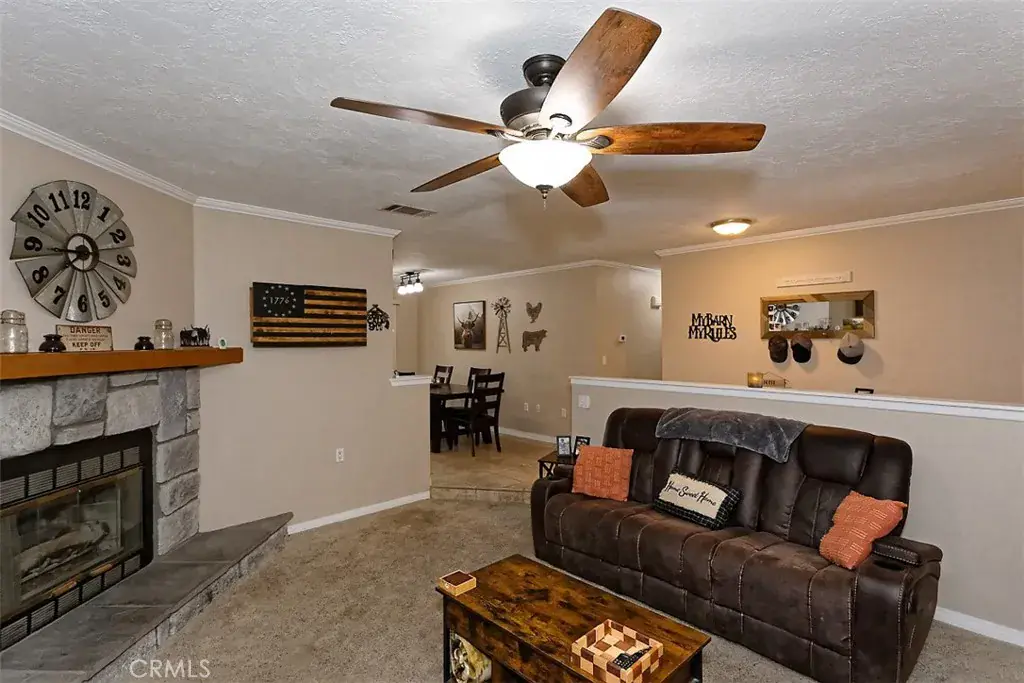 Welcome to 15052 Temecula Rd! A well-maintained home offering a open layout, tasteful upgrades and comfortable indoor-outdoor living. Upon entry your greeted by tile flooring in the foyer, kitchen and dining areas providing durability and easy maintenance, while the living room features plush carpet and a cozy stone fireplace, creating a warm and inviting focal point.