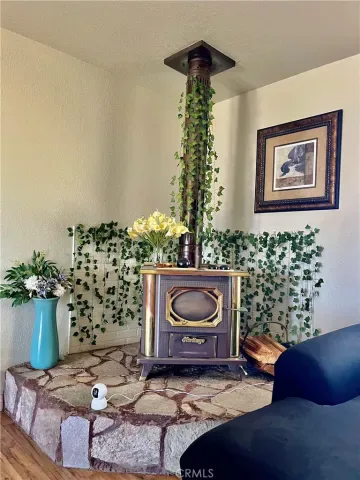 Step inside to a bright and open floor plan that flows effortlessly from the living room to the dining area, creating a welcoming space perfect for everyday living and entertaining. The living room features a raised hearth fireplace with a freestanding wood-burning stove, adding warmth, charm, and character to the home.