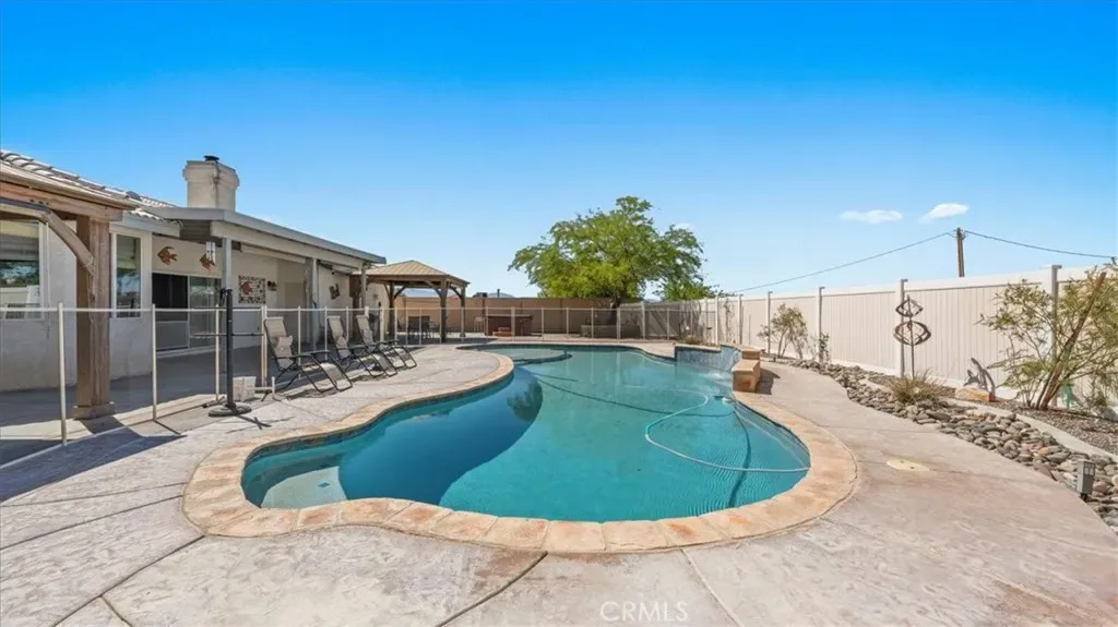Welcome to 16112 Century Plant Rd in Apple Valley, a truly one of a kind estate offering space, privacy and endless possibilities on a fully fenced and cross fenced one acre lot with breathtaking views in every direction. This exceptional pool home is designed for both comfort and functionality featuring five separate cross fenced yard areas with easy access gates ideal for animals, storage or creating your own private outdoor spaces. A private recorded side road provides convenient access to the rear of the property making it perfect for RVs, trailers and all your toys complete with a 50 amp hookup for easy plug in. Step into your own backyard retreat where a sparkling pool with waterfall is surrounded by vinyl fencing along with solar tube panels dedicated to pool heating plus a above ground jacuzzi. Enjoy outdoor living with two covered patios one with a ceiling fan, two oversized pergolas with privacy blinds and a beautifully designed rock and brick entertaining area. The property also features a dog kennel, rear carport and multiple functional outdoor zones including a paver side yard that can serve as a garden, dog run or additional storage space. Inside the home offers approximately 14 foot ceilings, skylights for natural light and ceiling fans throughout. The spacious living room features a cozy fireplace while the primary suite is a true retreat with its own fireplace, double door entry and unique architectural design. The primary bathroom includes a Victoria and Albert soaking tub, dual vanities, stained glass accents and a large walk in closet. The kitchen and dining areas offer abundant cabinetry, a walk in pantry with a stained glass door and a breakfast nook just off the kitchen. An added bonus is the detached exterior room with its own heating and air conditioning perfect for a home office, gym or guest space complete with French doors and natural light. Additional features include 30 solar panels on the home, a new 50 amp RV outlet, a brand new water heater built to current standards, a second water heater installed in 2017, updated toilets in two bathrooms, a new water pressure regulator and a solar diverter installed in the garage in 2024. This property offers the rare combination of privacy, versatility and lifestyle with room to bring all your toys, create your own spaces and enjoy peaceful desert living.