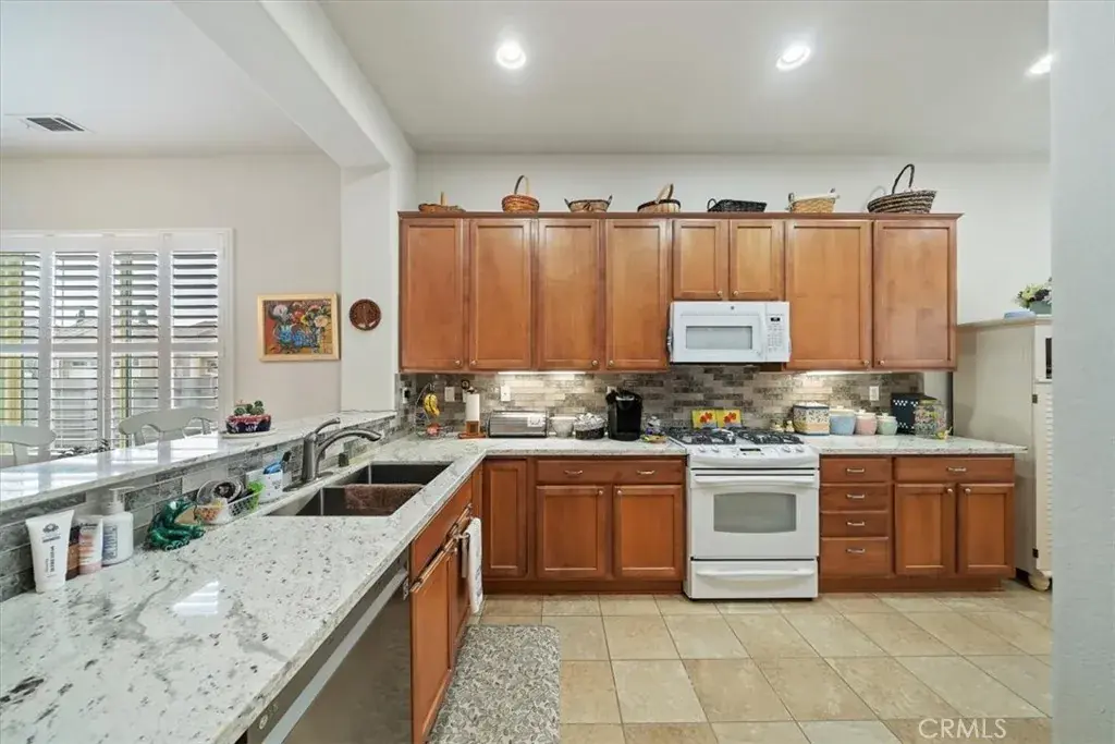 This home has everything you need to enjoy within a well-maintained, gated, Senior community with countless activities and events to participate in or relax and enjoy the peaceful comforts of being home! Enjoy entering this beautiful home with an open floor plan featuring spacious rooms and an updated kitchen equipped with newer granite countertops, full backsplash, abundant cabinetry with pull-out drawers, pantry, a dining area with a view, and a large bar counter providing additional space for entertaining. Additional features include lovely plantation shutters, recessed lighting, ceiling fans, a beautiful fireplace, and an indoor laundry room with wash basin and ample storage cabinets. The primary bathroom offers a walk-in closet, walk-in shower, and a dressing area with generous counter space, double sinks, and lighting options.