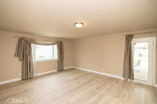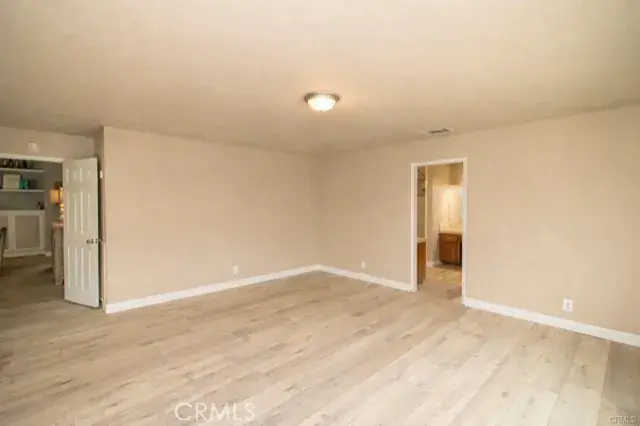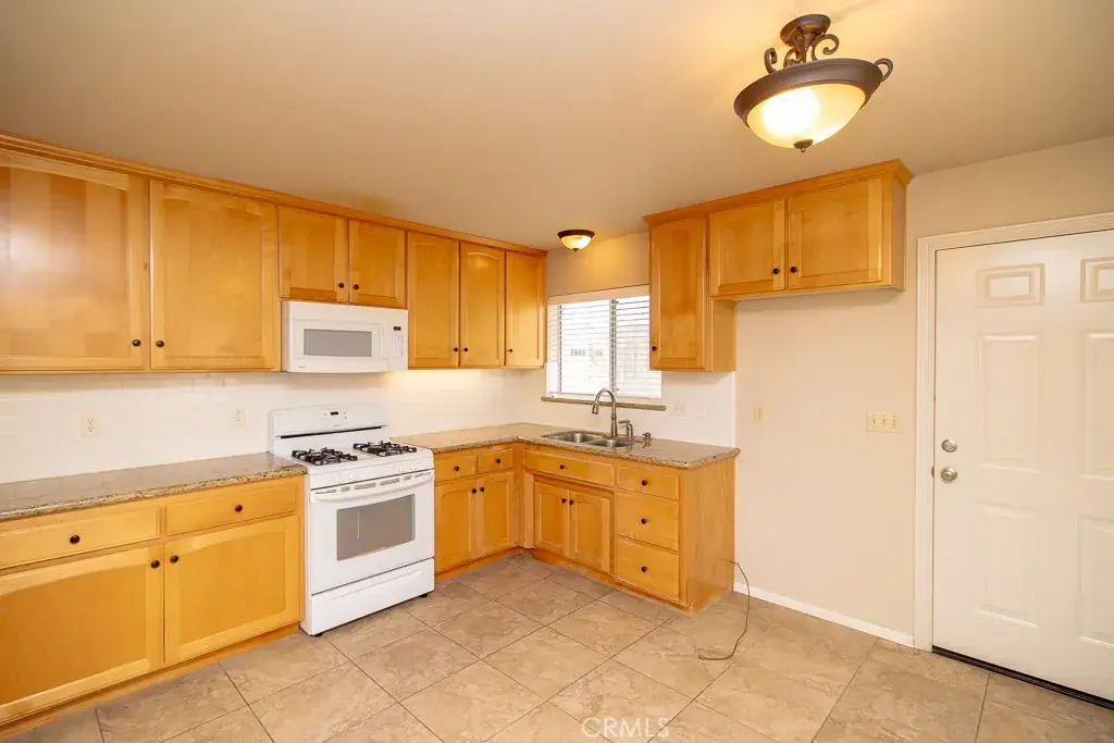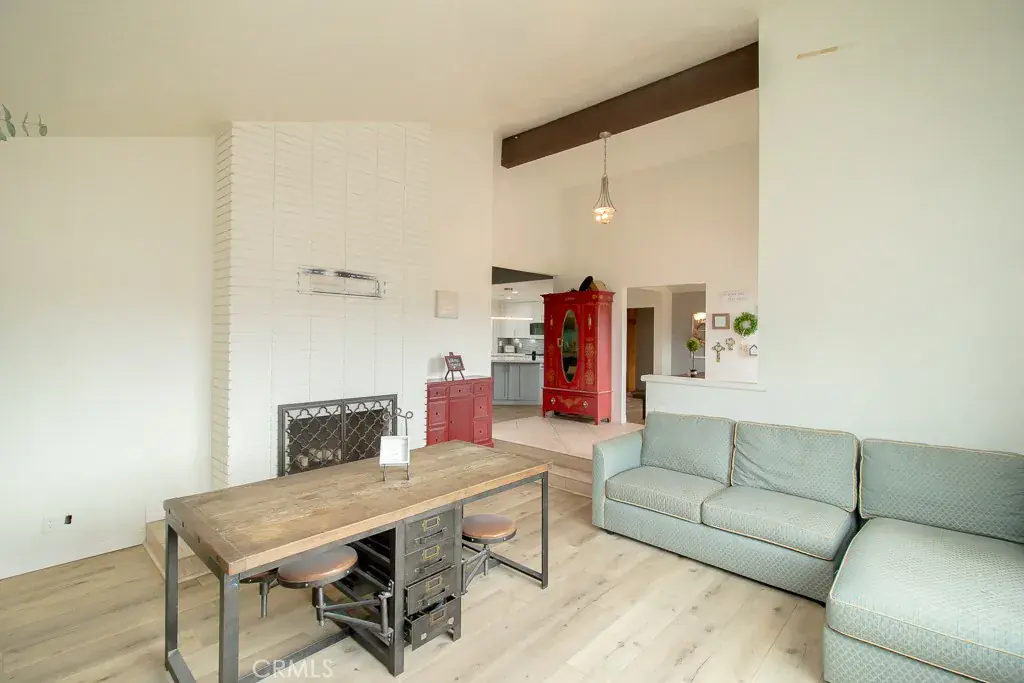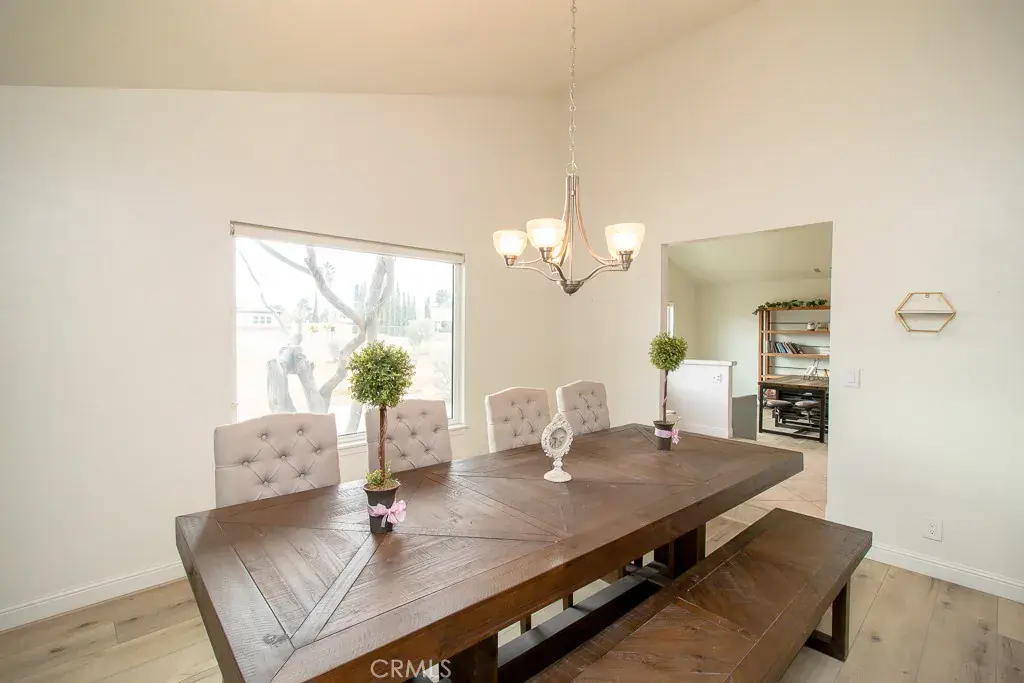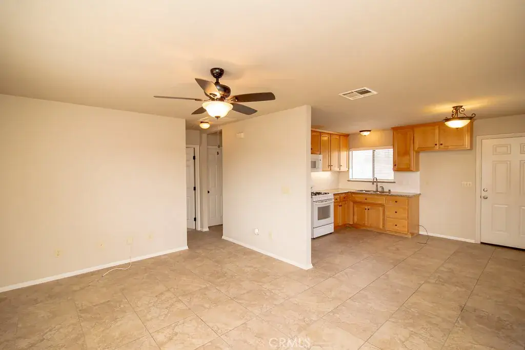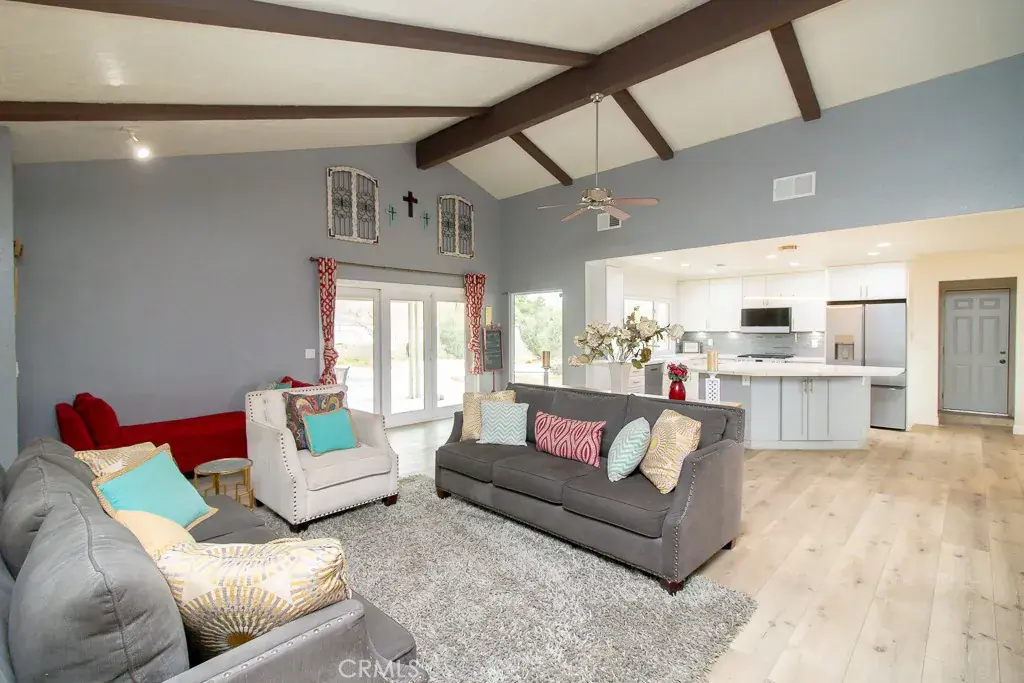 The Main House itself has 3 Bedrooms, 2 Bathrooms, 2-Car Garage, and RV Access. As you enter the main home, you’re greeted by a thoughtful layout with a living room to the left and a formal dining room to the right. The home immediately impresses with vaulted wood-beam ceilings, creating an open and airy feel. Fresh interior paint enhances the bright, inviting atmosphere throughout.