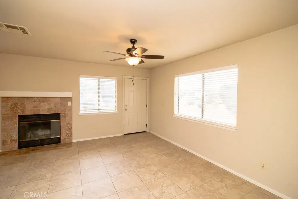The living room and family room share a dual fireplace, perfect for cozy evenings. The remodeled kitchen, completed in 2021, features updated finishes and comes equipped with a stove, microwave, and dishwasher. The air conditioner is approximately six years old, offering peace of mind for year-round comfort. All windows throughout the home have been upgraded to WeatherTech windows.