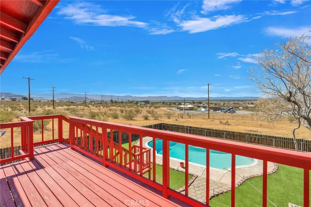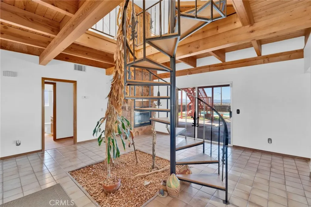 Inside, a spiral staircase adds a striking architectural touch, and windows filling the home with natural light while offering peaceful desert and mountain views. Step outside to a private balcony or a backyard oasis with an in-ground pool, perfect for relaxing, entertaining, or enjoying the High Desert sun.