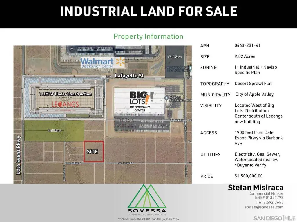 An opportunity to acquire 9.02 Acres of industrial land on Los Padres Road across from the Big Lots Distribution Center and just south of the new Lecangs 1.1 Million SF distribution center. This site is ideal for a industrial user or developer that can see the future potential. This site is in the path of growth making it strategic asset that will appreciate well into the future.