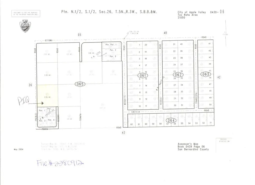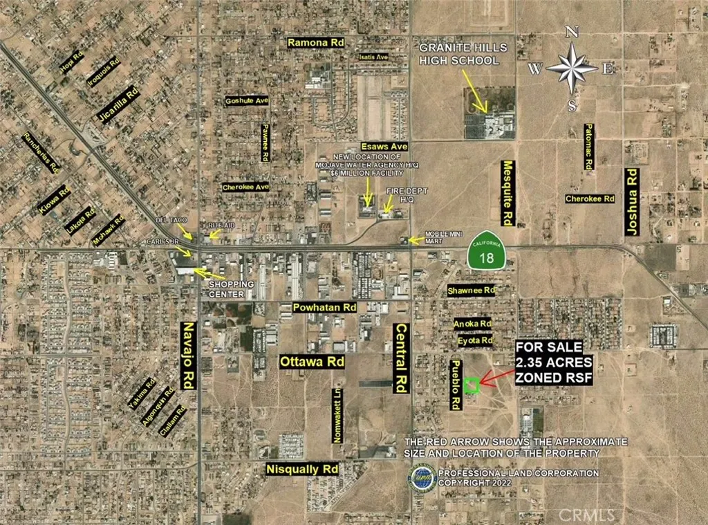 This prime 2.35-acre high density residentially zoned land parcel is located in an area of established single family homes in the city limits of Apple Valley on the east side of paved Pueblo, which is located about 1.42–miles northeast of Apple Valley Middle School, about 1.76-miles northeast of the Stater Bros. Zoning is RSF which permits two half-acre estate sized residential lots per acre, or up to 4 estate-sized residential lots on this property. The development of this property would be subject to the requirements and development approval of the Town of Apple Valley. Shopping Center, about .25-miles east of Central, about 1.69-miles northeast of Apple Valley High School, about 1.13-miles north from Granite Hills High School, and about 1.31-miles north of Bear Valley Rd. Bear Valley Rd is the prestige thoroughfare of the Victor Valley. At the southeast corner of Bear Valley and Navajo is Apple Valley High School that already has a large student population. This High School is a modern and technologically advanced facility, boasting of its own professional sports stadium. On Esaws, east of Central and west of Joshua, is Granite Hills High School that already has a student population over 2000 with its own performing arts center.