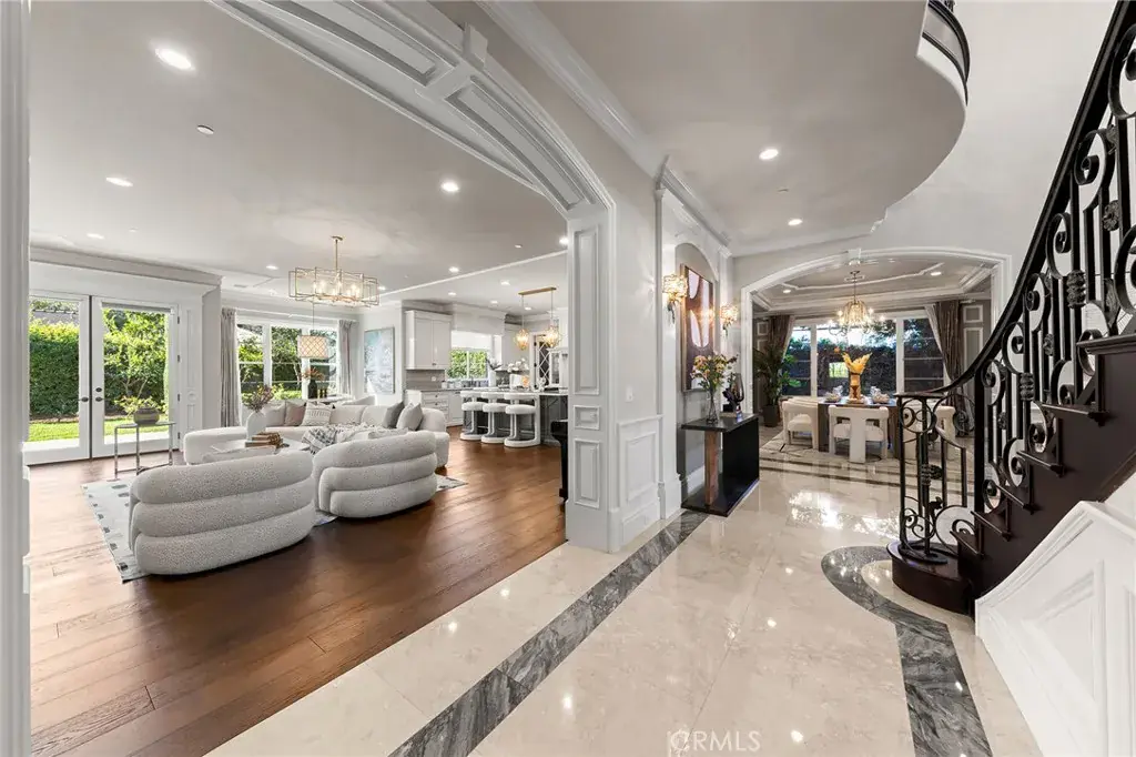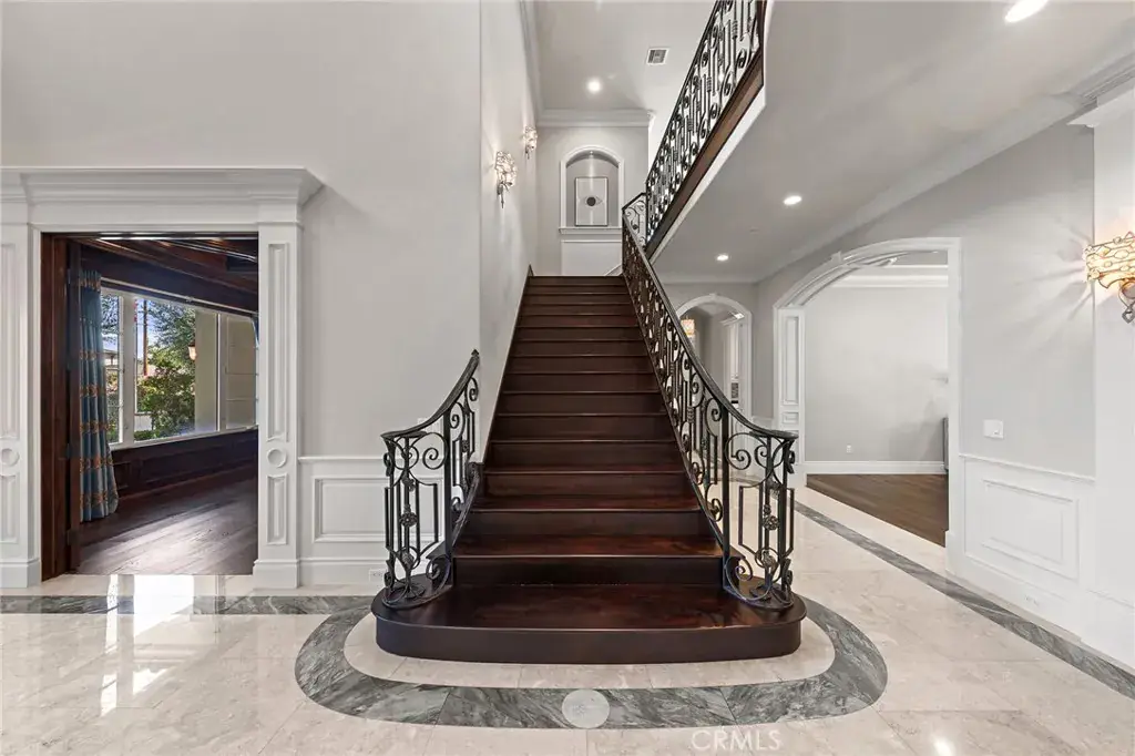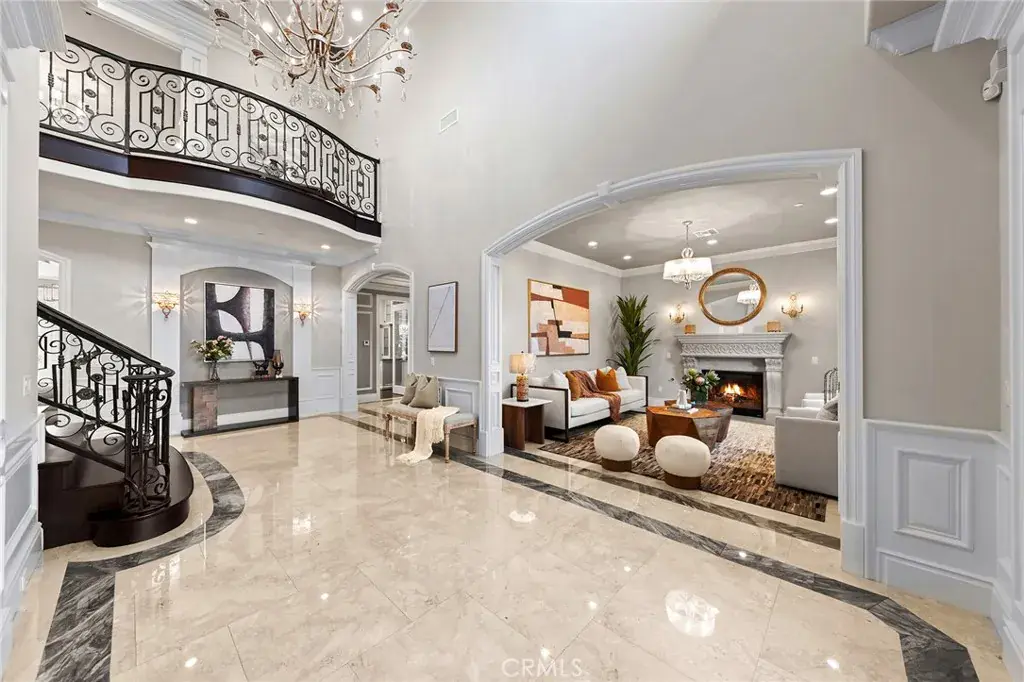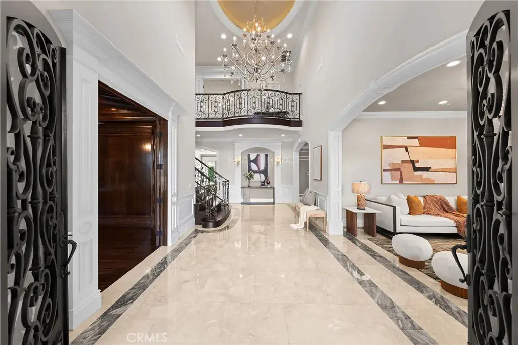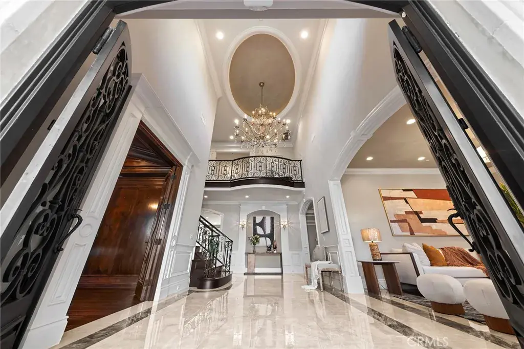 Set on a 10,368 sq ft lot, the home offers approximately 5,480 sq ft of refined living space, featuring a bright, well-proportioned floor plan curated for elevated luxury living. A grand formal foyer welcomes you with soaring ceilings, marble flooring, crystal chandeliers, and an elegant wrought-iron staircase, creating an immediate sense of distinction.