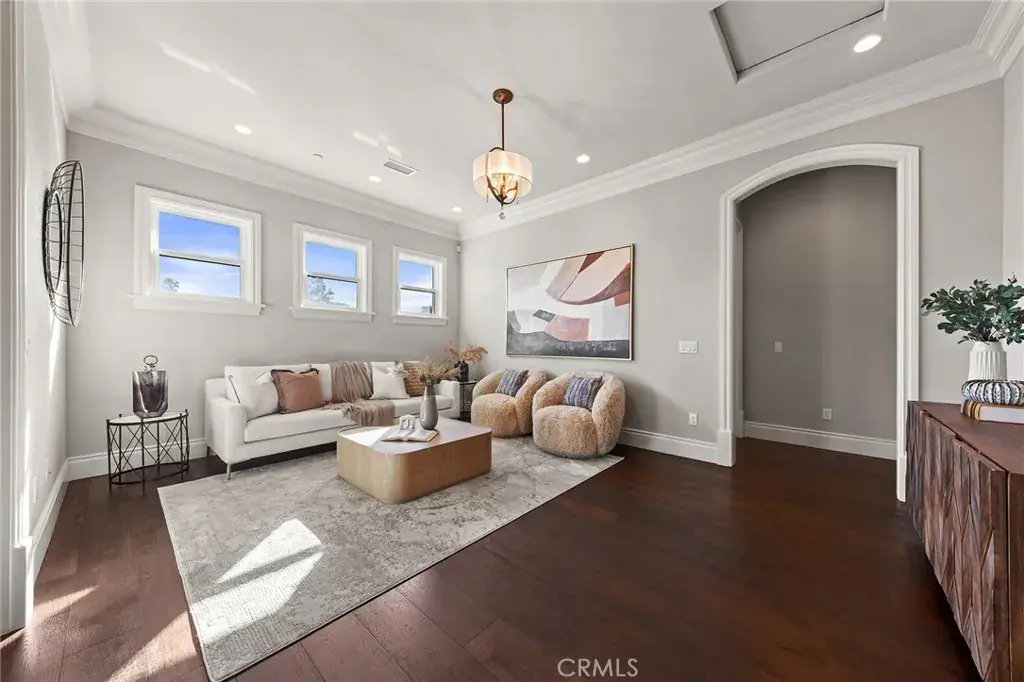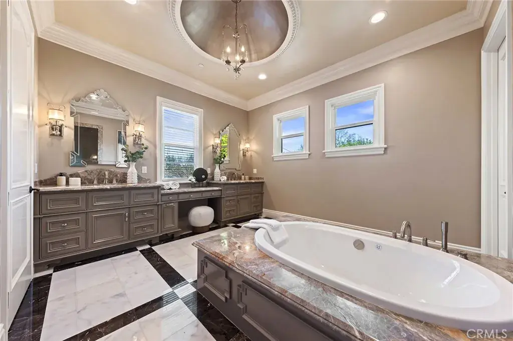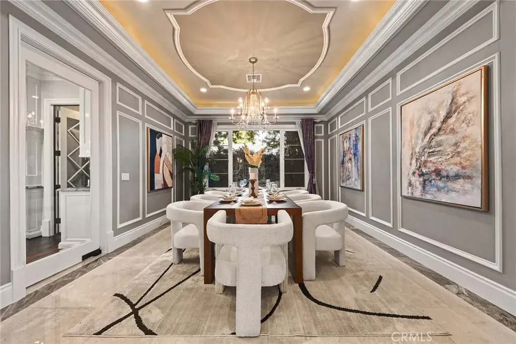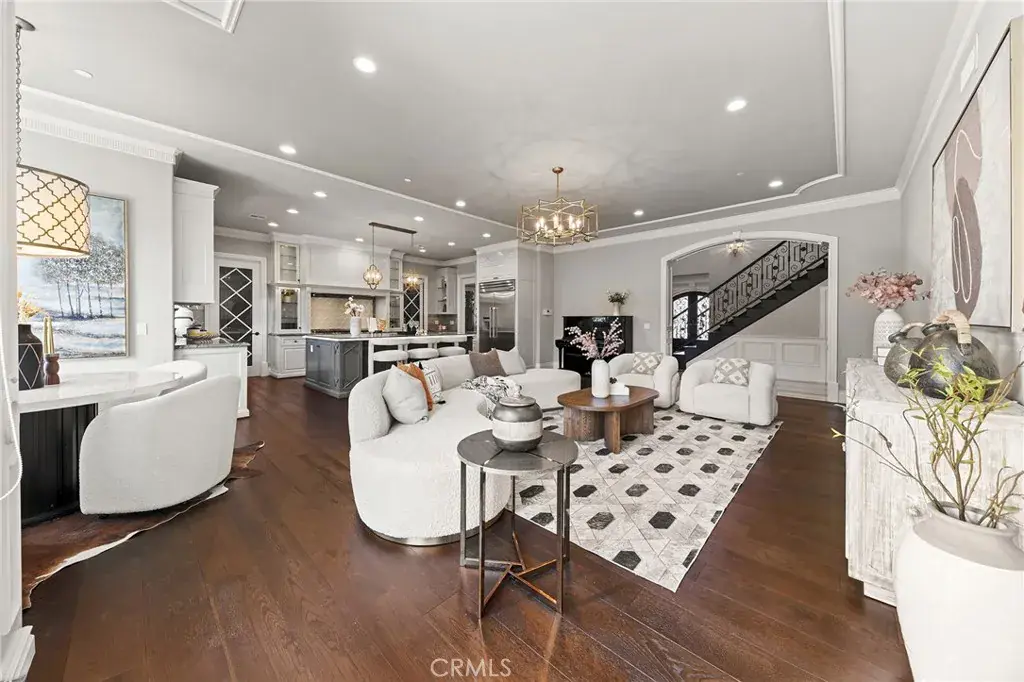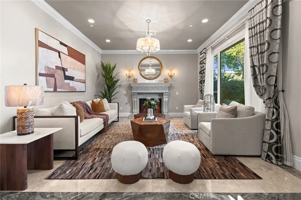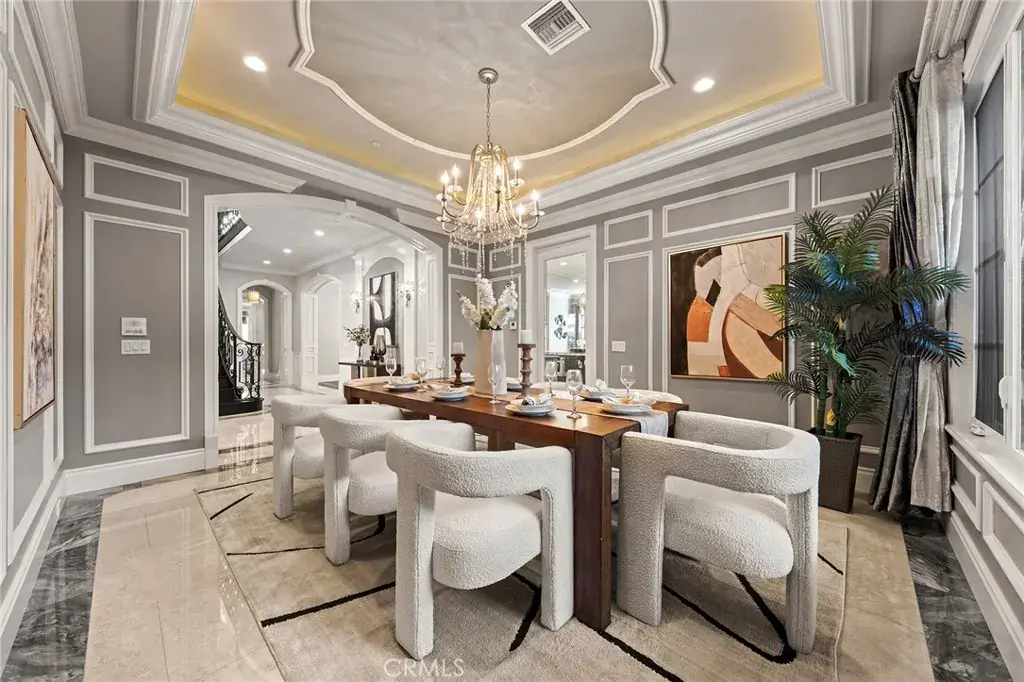Set on a 10,368 sq ft lot, the home offers approximately 5,480 sq ft of refined living space, featuring a bright, well-proportioned floor plan curated for elevated luxury living. A grand formal foyer welcomes you with soaring ceilings, marble flooring, crystal chandeliers, and an elegant wrought-iron staircase, creating an immediate sense of distinction.