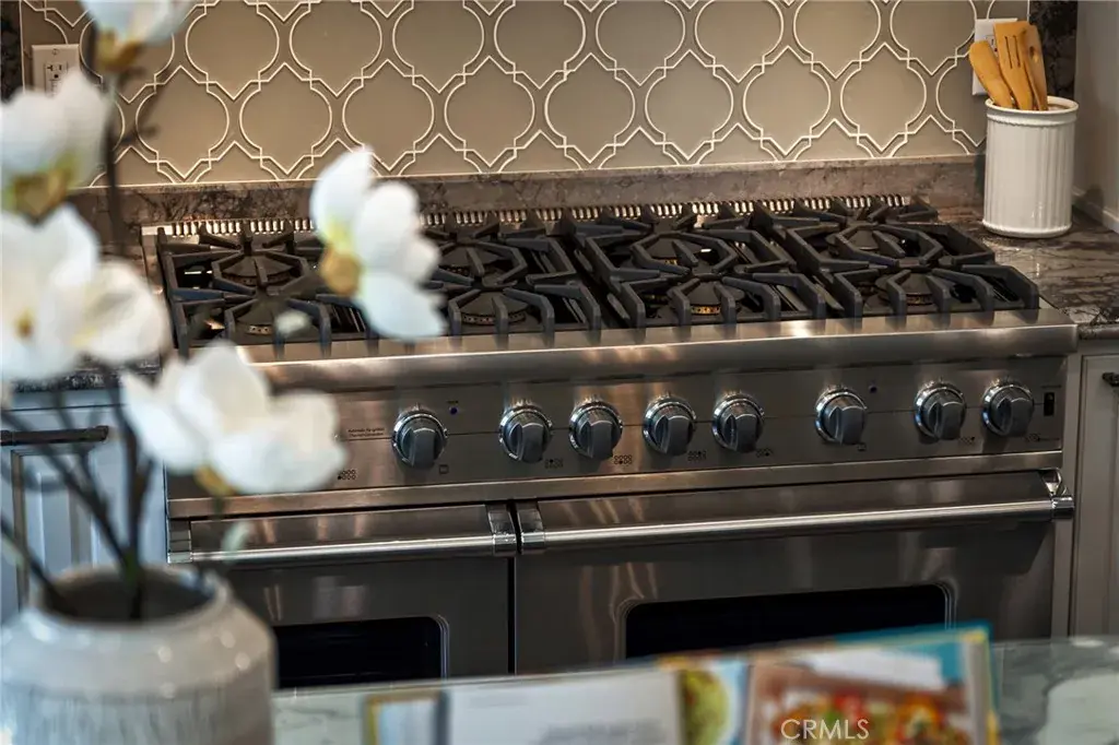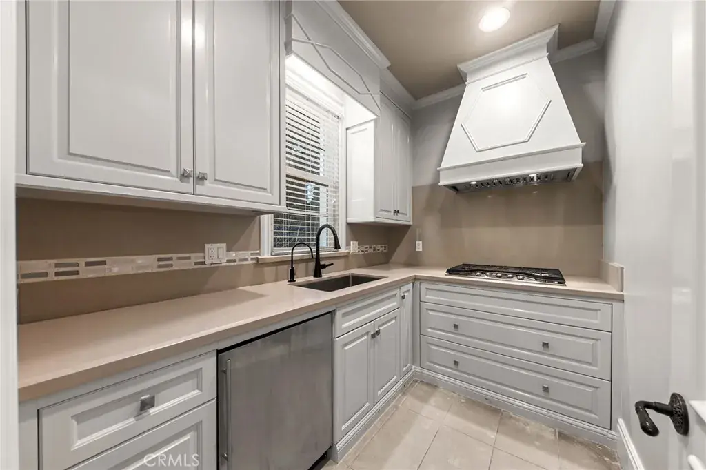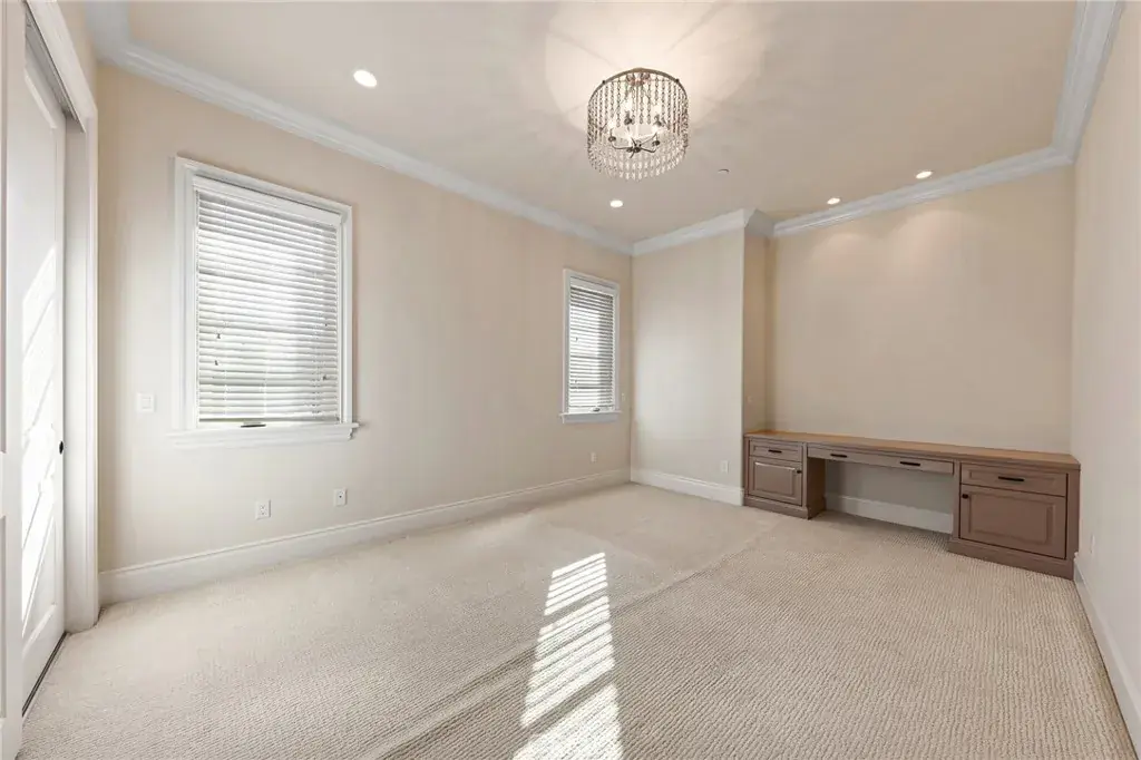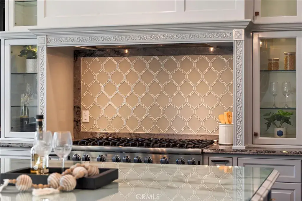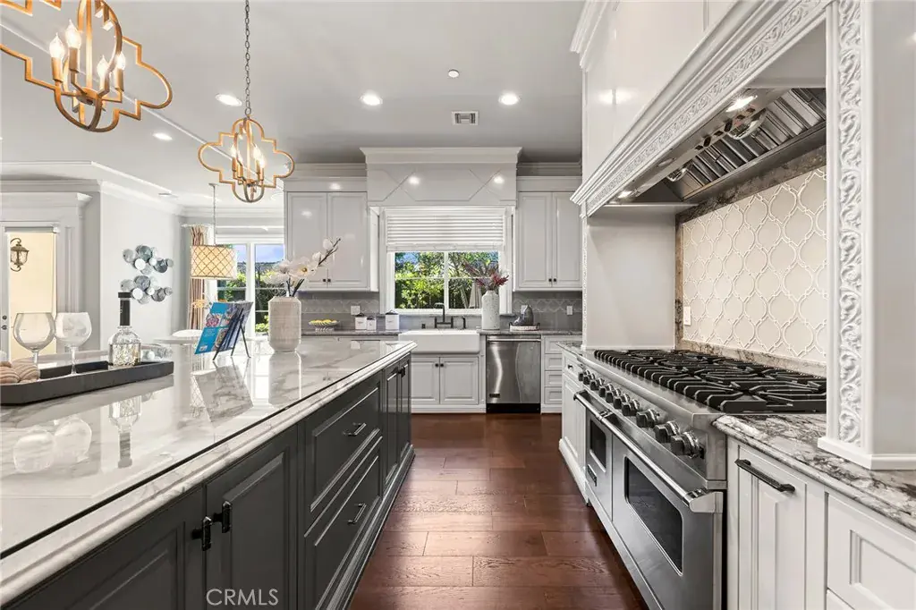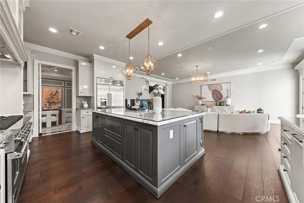 The gourmet gallery kitchen is thoughtfully designed for culinary excellence, featuring top-of-the-line Viking appliances, an 8-burner cooktop, built-in Thermador refrigerator, custom cabinetry, and an expansive center island. A separate Asian kitchen and a dedicated wine cellar further enhance the home’s functionality and sophistication.