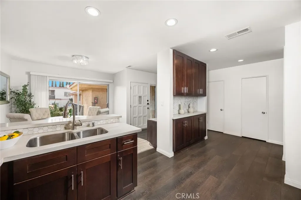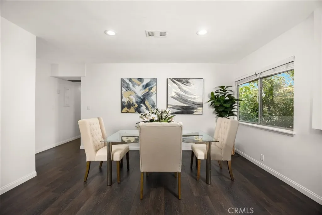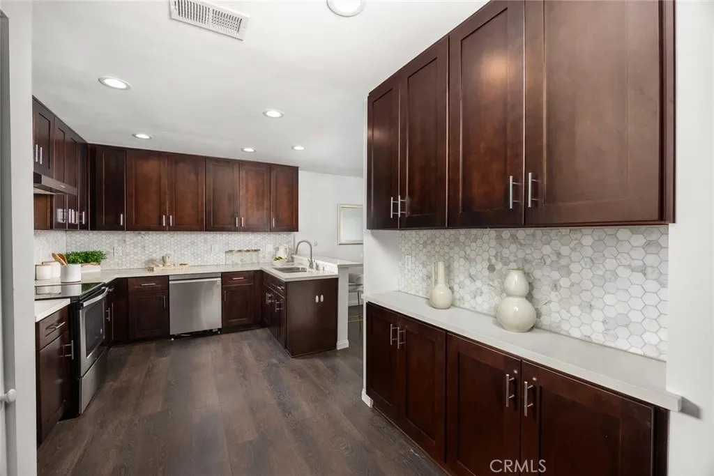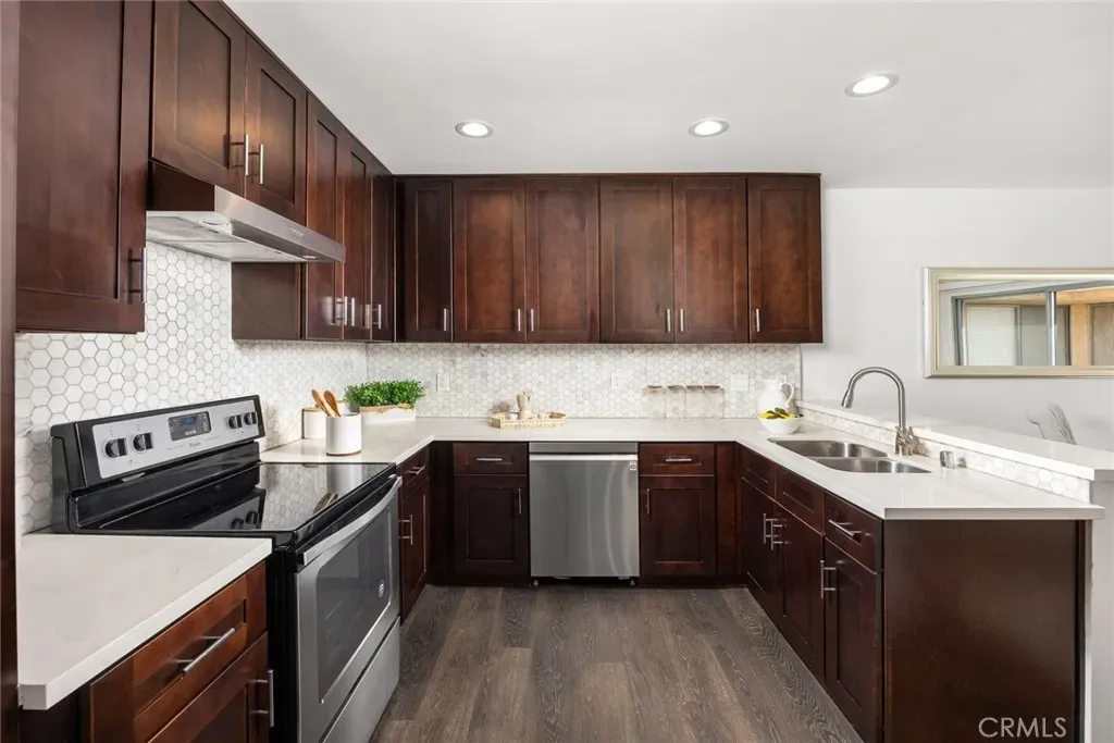 The upgraded kitchen is appointed with newer cabinetry, quartz countertops, designer backsplash, and stainless steel appliances, and opens to a cozy dining area enhanced by updated lighting.