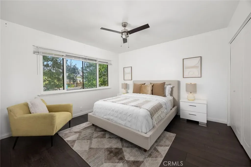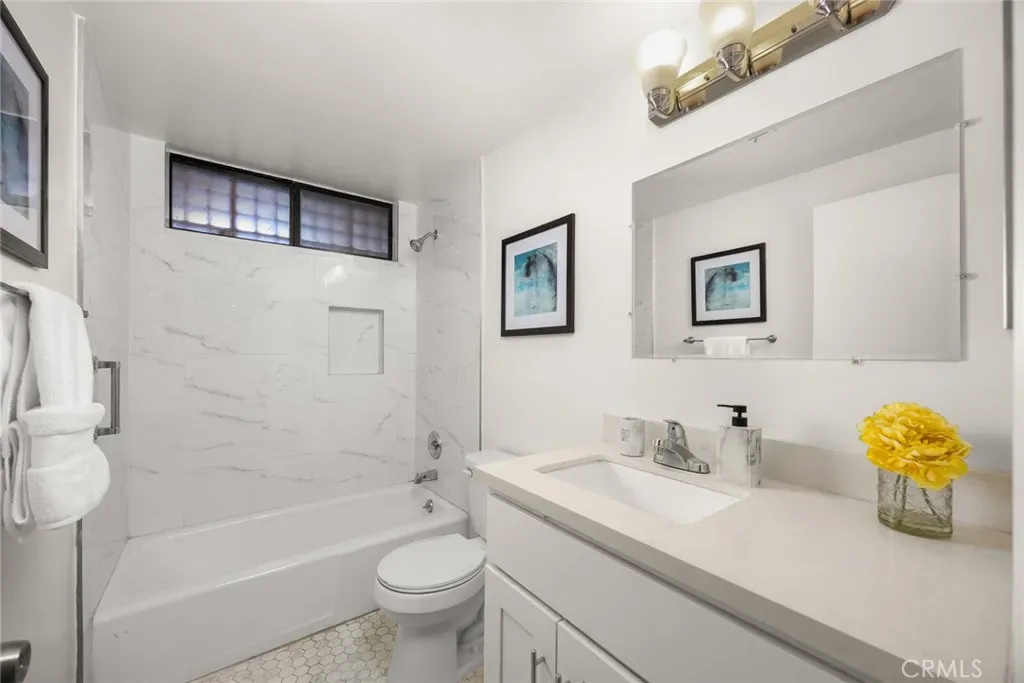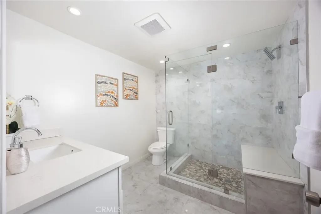 The primary suite is generously sized, and the bathroom showcases an upgraded shower with a built-in seating area. The secondary bathroom is also well-proportioned and thoughtfully updated with modern finishes. All bathrooms feature updated vanities and fixtures.