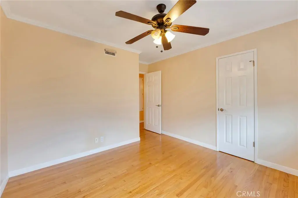 The master bedroom provides a comfortable space with a sliding glass door leading to the backyard, and an upgraded bathroom with a tiled shower stall. Additional interior highlights include ceiling fans, crown molding, hardwood and tile flooring throughout. Recent improvements include a newer roof and central air conditioning.