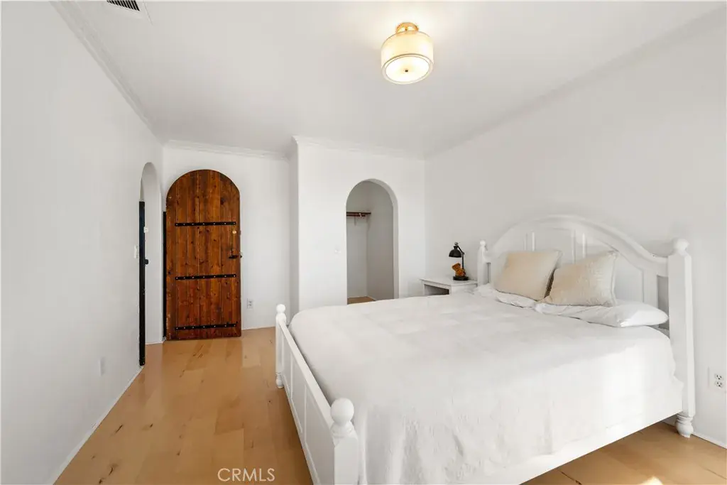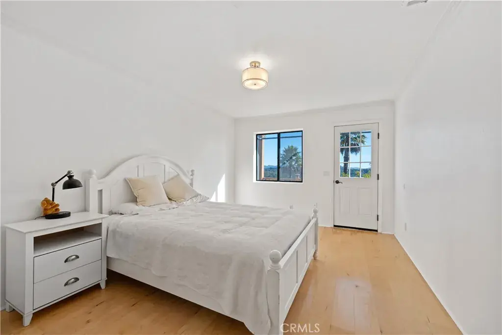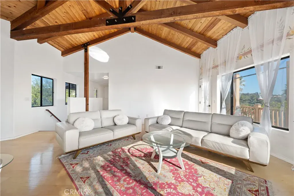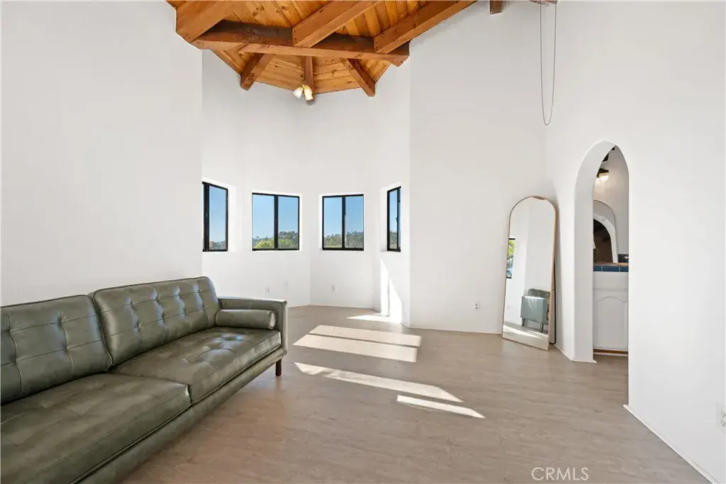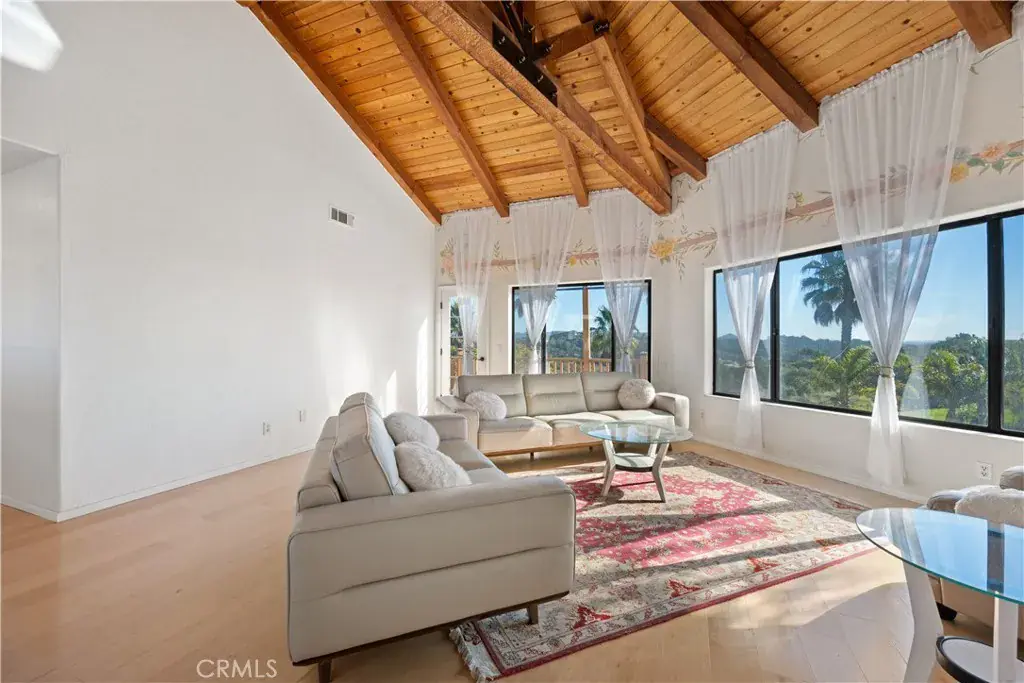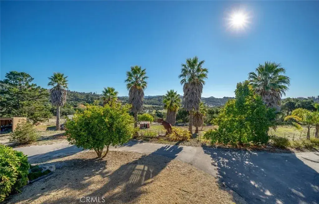 A long private driveway leads to a peaceful arrival featuring a small orchard with a variety of fruit and citrus trees—a setting that feels worlds away while remaining conveniently located. Inside the main home, timeless architectural details include graceful archways, wood-beamed ceilings, skylights, and expansive windows that flood the home with natural light. Multiple view balconies provide the perfect backdrop for morning coffee or sunset evenings.