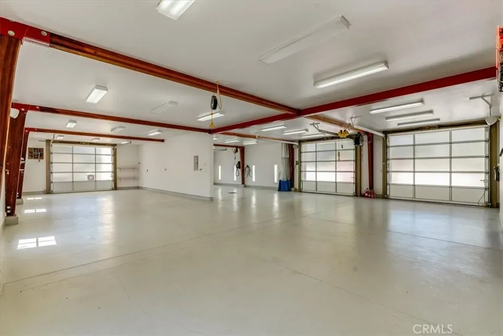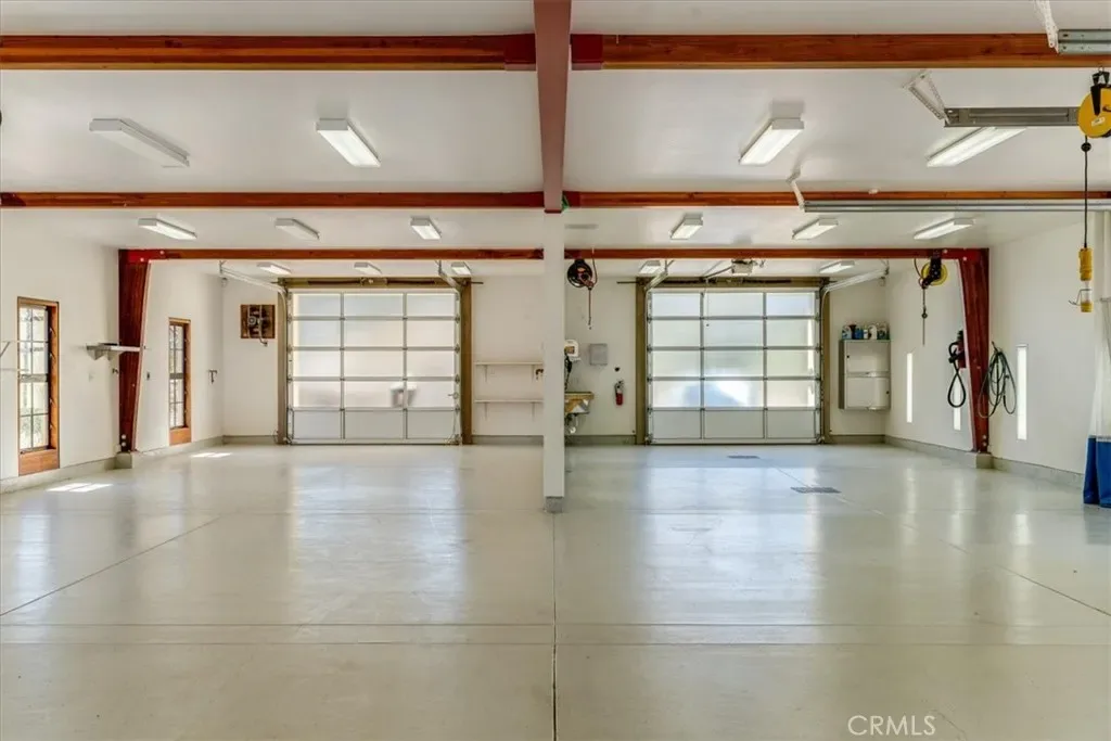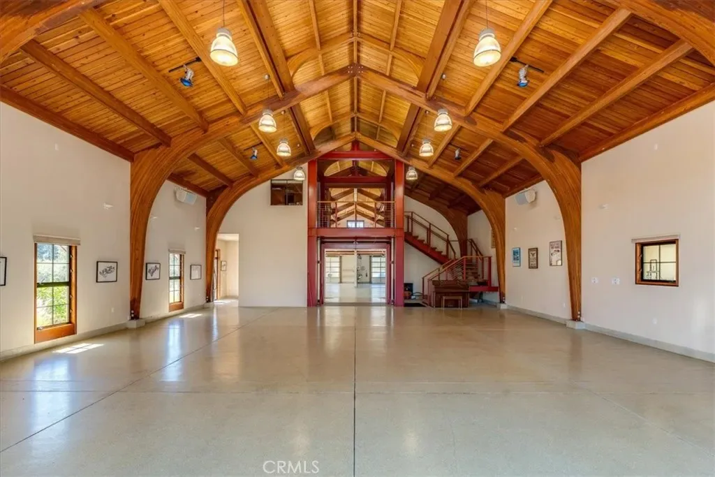 7,192± sq ft multi-use building with 35-ft wood beam ceiling designed for collections, automotive, workshop, studio, or event use; includes open spaces, garages, service lift, kitchen area, ¾ bath, and office or potential guest quarters.