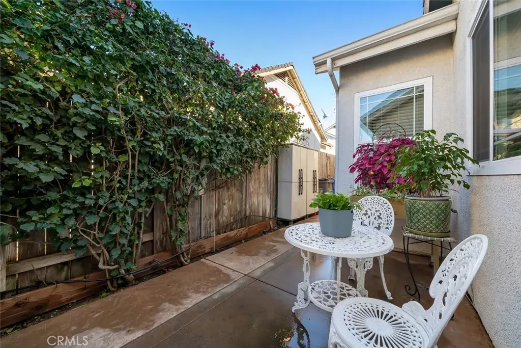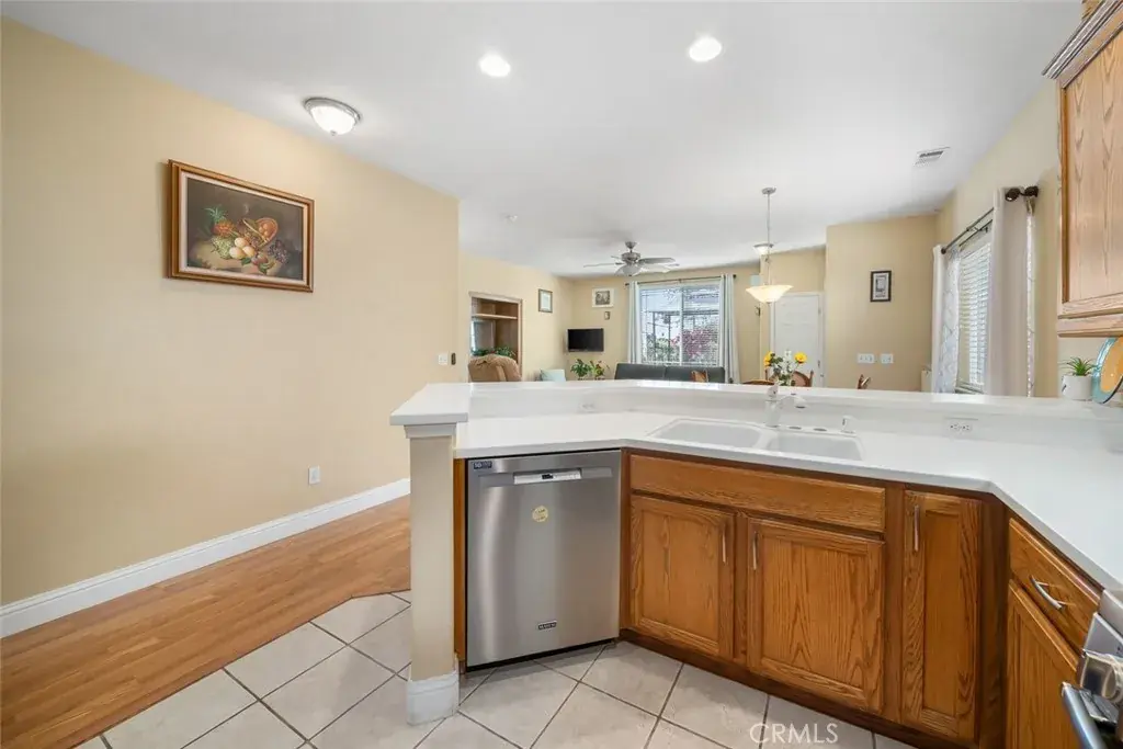 The kitchen is well-appointed with Corian countertops, stainless steel appliances—including a dishwasher, refrigerator, gas range with double oven, and microwave—and a wraparound counter that provides breakfast bar seating and is perfect for entertaining. An office with built-in storage opens to the backyard, where a private concrete patio offers a lovely spot to relax.