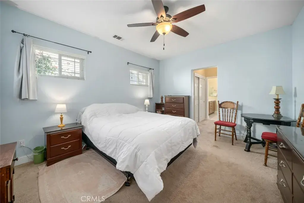 The primary suite includes a ceiling fan and an ensuite bathroom with a tiled walk-in shower and dual-sink vanity. A second bedroom with its own ensuite bath completes the interior. An attached two-car garage provides convenient parking and additional storage. This home offers thoughtful design and versatile living spaces in a sought-after neighborhood, conveniently located near local shopping, the Village of Arroyo Grande, the beach, and more.