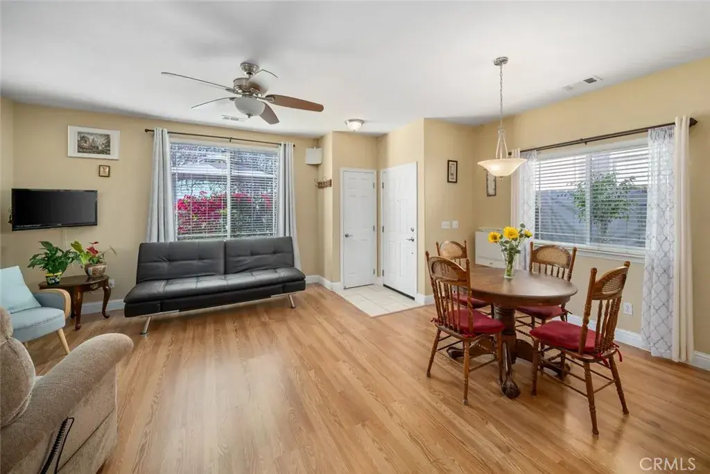 The cutest single level home in the Brambles of Arroyo Grande! This charming two-bedroom, two-bath, single-level residence boasts adorable curb appeal with a white picket fence, front patio, and colorful shrubbery. Inside, an inviting open-concept layout is filled with natural light streaming through multiple windows. The living room features a quaint built-in and ceiling fan, creating a warm and welcoming space.