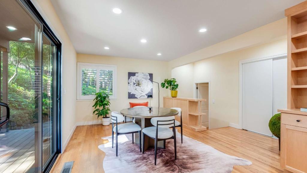 Private, resort-like mid-century modern retreat on over an acre, surrounded by lush greenery and mature trees. Beautifully remodeled with ~5,106 sq.ft., soaring ceilings, and floor-to-ceiling windows capturing tranquil views from every room. Flexible layout with 4 bedrooms, 3.5 baths, guest suite, office, and expansive decks overlooking a serene natural setting. Prime location near Stanford, VC HUB, and downtown Palo Alto. Buyer to verify square footage, lot size, permits, and schools to their satisfaction.