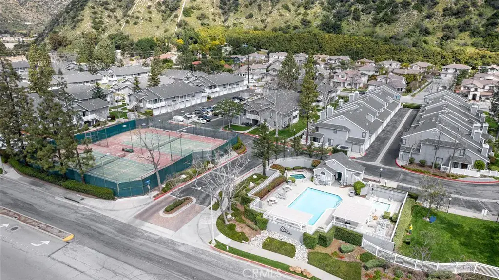 The unit includes a one-car garage, one assigned parking space, and additional street parking along Ranch Road. The homeowners association provides water and trash service and offers resort-style amenities, including a swimming pool, spa, and tennis courts.