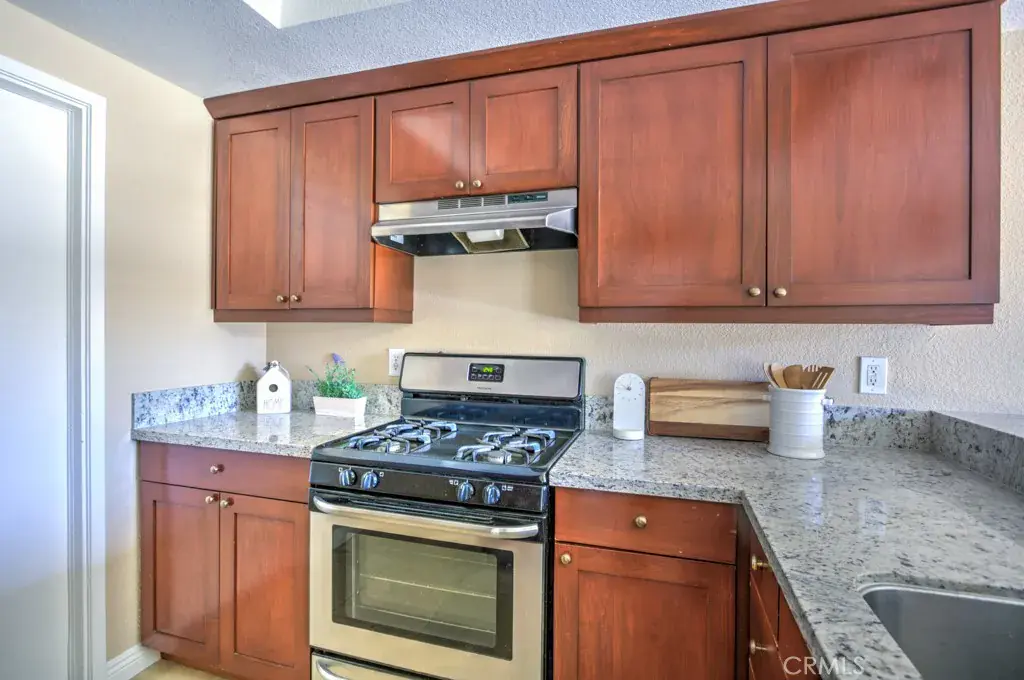The open living and dining area is bright and airy with plenty of natural light. The kitchen includes granite countertops, refinished cabinets, a gas stove/oven with range hood, and a breakfast bar.